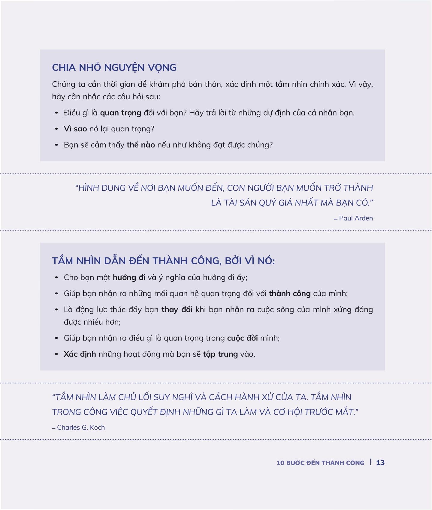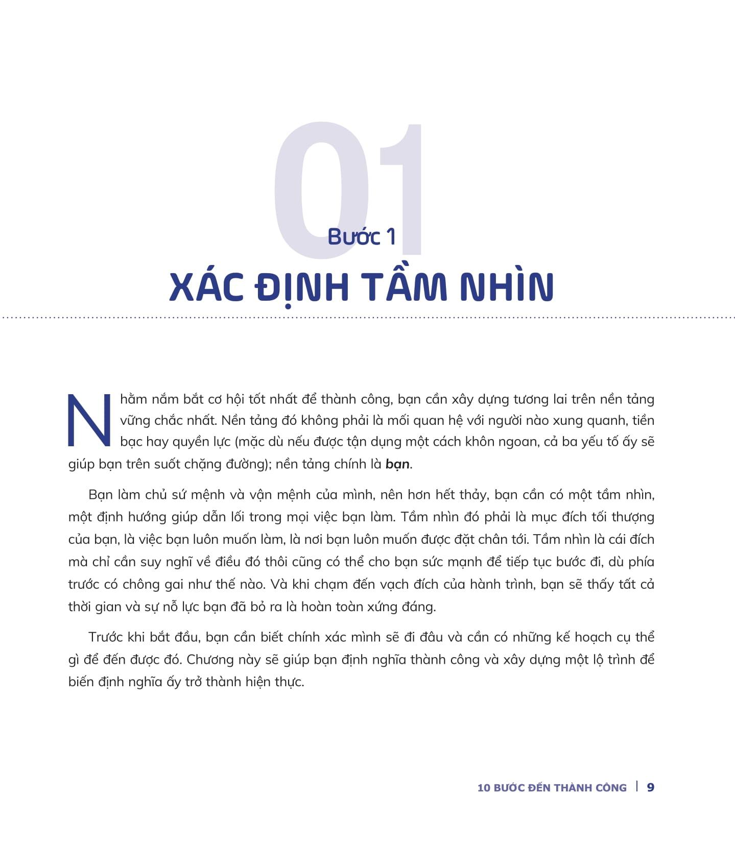 Thành công tùy thuộc vào tư duy và cách nhìn nhận của bạn – thứ sẽ kiểm soát cách bạn ứng xử và tương tác với những người xung quanh. Cuốn sách “10 bước đến thành công” sẽ giúp bạn phát triển lối tư duy chiến thắng và hướng dẫn bạn vận dụng nó trong suốt hành trình chạm đến vinh quang. Nếu không có nhận thức và góc nhìn đúng đắn, hành trình của bạn sẽ đầy gian nan, và bất cứ rào cản nào cũng có thể trở thành chướng ngại khó vượt qua. Chuẩn bị tinh thần sẵn sàng đón nhận mọi khó khăn sẽ giúp bạn dễ dàng vượt qua thử thách hơn nhiều trên con đường mình chọn.
