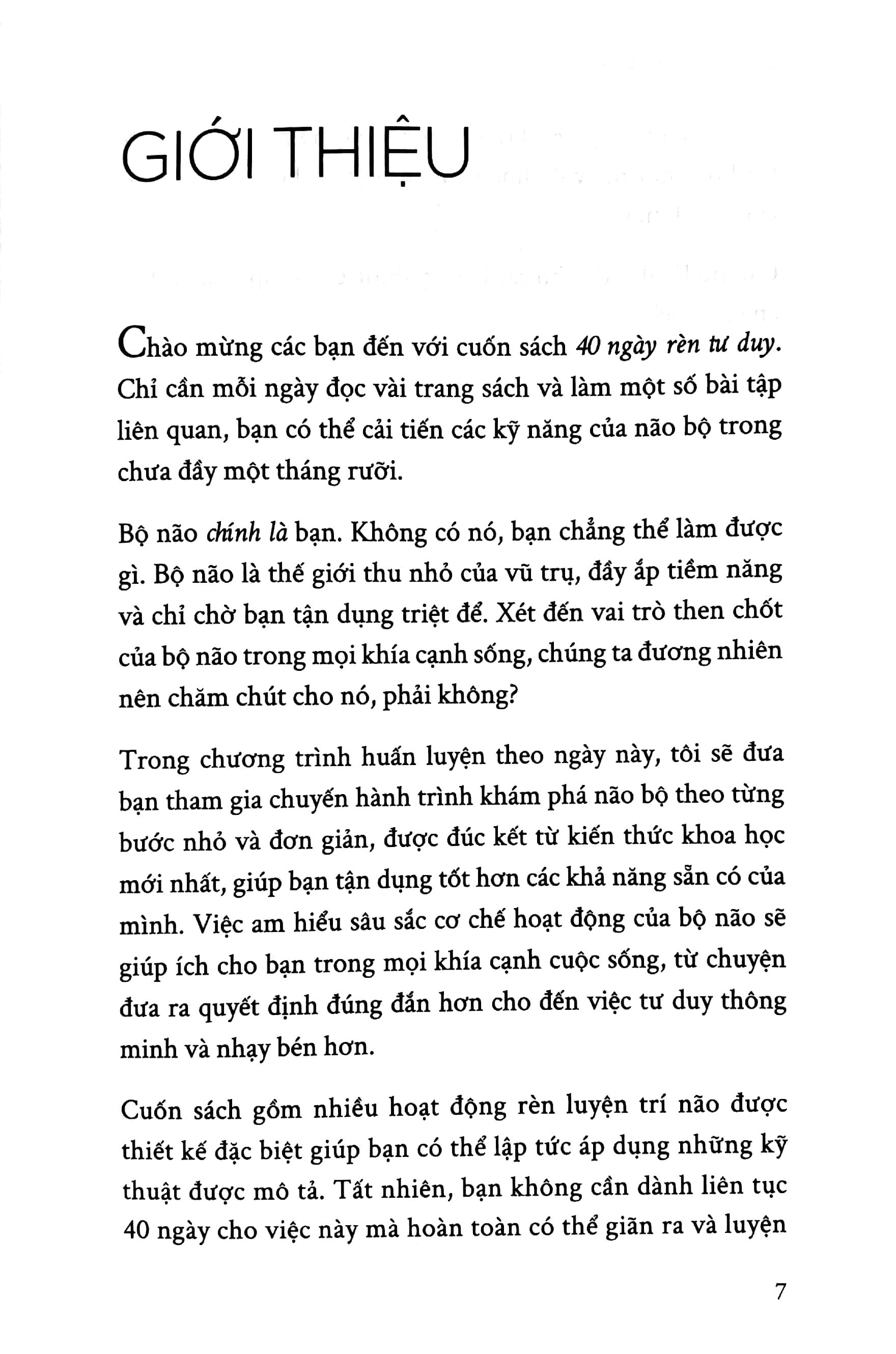 100+ Bài Tập Kích Thích Não Bộ Hiệu Quả: 40 Ngày Rèn Tư Duy Bộ não đóng vai trò then chốt trong mọi khía cạnh cuộc sống của chúng ta, vậy nên nó rất cần được chăm chút. Cuốn sách 40 ngày rèn tư duy là một chương trình huấn luyện theo ngày, khám phá não bộ theo từng bước nhỏ và đơn giản, giúp người đọc hiểu sâu cơ chế hoạt động của bộ não nhằm tận dụng tốt hơn các khả năng sẵn có, đồng thời cải thiện các kỹ năng của não bộ trong chưa đầy một tháng rưỡi.