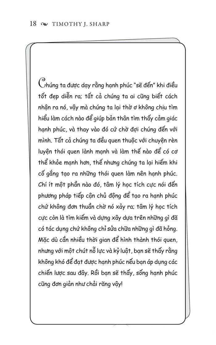 Bạn có hạnh phúc không? Khi bế tắc và xuống tinh thần, bạn có tự thuyết phục mình rằng, bạn không có đủ thời gian và năng lượng để theo đuổi một cuộc sống viên mãn? Hãy suy nghĩ lại đi! Trong quyển sách bổ ích và đầy cảm hứng này, Dr. Timothy J. Sharp chia sẽ 100 động cơ nâng đỡ tinh thần, có thể thực hành một cách nhẹ nhàng mỗi ngày và mang lại cho bạn những kết quả tốt đẹp, làm thay đổi cuộc đời về sau.