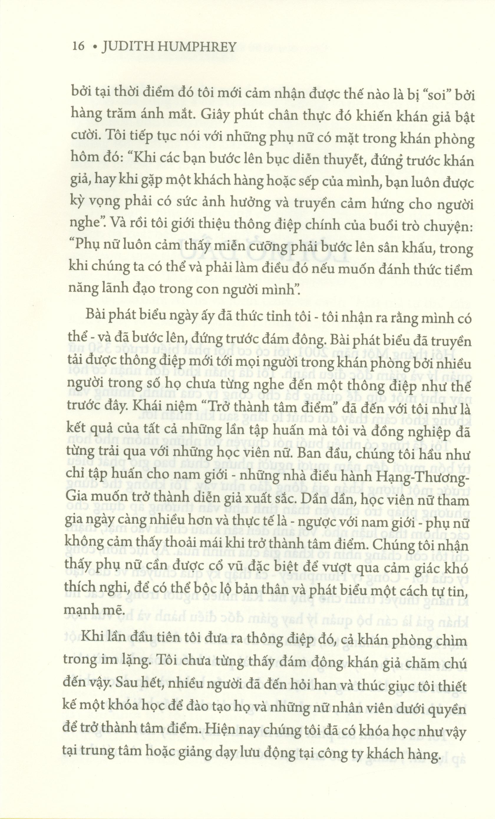 25 BÍ QUYẾT ĐỂ TRỞ THÀNH NỮ LÃNH ĐẠO TÀI BA - cách phụ phữ trở thành tâm điểm được viết cho đối tượng phụ nữ, và cũng dành cho những người muốn ủng hộ sự thành công của phụ nữ. Cuốn sách này còn dành cho những nhà lãnh đạo muốn xây dựng một đội ngũ mạnh mẽ, đa dạng, hay những người có vợ, đối tác nữ, hay con gá Xa hơn, cuốn sách dành cho những ai quan tâm đến phụ nữ, tương lai của phụ nữ trẻ, và giá trị của người phụ nữ mang lại cho doanh nghiệp, ngành nghề, cộng đồng và gia đì họ lên tiếng và nổi bật trong vai trò người lãnh đạo mạnh mẽ, tự tin. Thông điệp của cuốn sách này muốn nhấn mạnh việc phụ nữ cần phải ra khỏi cánh gà sân khấu nếu như họ muốn có ảnh hưởng mạnh mẽ hơn với doanh nghiệp và thành công trong công việc và cuộc sống. Hành trình của họ đến với tâm điểm đòi hỏi một tư duy thể hiện bản thân làm trọng tâm và khả năng giao tiếp một cách hiệu quả và truyền cảm hứng. Để có được thành công, còn cần đến sự ủng hộ của cấp trên, người hướng dẫn, nhà tài trợ. Các quản lý và lãnh đạo cấp cao có nhân viên nữ sẽ thấy phần “Lời khuyên cho cấp lãnh đạo” sau mỗi chương để gợi ý cách hỗ trợ và hướng dẫn cho nữ nhân viên của m.ình để áp dụng thực tế và tăng cường những bài tập của cuốn sách. Cuốn sách này còn là chia sẻ kinh nghiệm của những phụ nữ đã tham gia khóa học Trở thành tâm điểm, hay ứng dụng nó, từ khắp nơi trên thế giới. Một số người đã trở thành những người bạn thân thiết của tôi. Nhiều người đã chia sẻ sự tiến bộ và niềm tin của họ với tôi khi được phỏng vấn qua điện thoại hay . Những câu chuyện đến từ người ở nhiều vùng miền, nhiều ngành nghề và nhiều cấp bậc khác nhau. Dựa trên khóa học của tập đoàn Humphrey đã được phổ biến tới 400,000 phụ nữ trên toàn thế giới, Trở thành tâm điểm, hướng dẫn phụ nữ ở mọi lứa tuổi, vị trí, nghề nghiệp – làm thế nào để giao tiếp với sự dũng cảm và tự tin trong mọi tình huống, từ những bài phát biểu chính thống cho đến những cuộc trò chuyện gẫu nơi hành lang. Judith Humphrey mang đến nguồn cảm hứng và những lời khuyên thiết thực cho những phụ nữ để trở thành tâm điểm trong tư duy, bằng lời thoại, trong giọng nói và bằng sự hiện hữu. Phụ nữ có thể nắm bắt mọi cơ hội đến với họ bằng cách hiểu được làm thế nào tốt nhất để:  Phát ngôn một cách tự tin, ngay cả khi không nhận được sự đồng thuận của những người khác  Mạnh dạn nhận lời khen ngợi  Quyết đoán nhưng không kiêu ngạo  Truyền đạt những thông điệp rõ ràng và thuyết phục  Chấm dứt những cử chỉ tự giới hạn bản thân và ngừng nói xin lỗi  Tìm lại toàn bộ âm lượng và phát triển giọng nói lãnh đạo thiên bẩm  Tạo lập ngôn ngữ cơ thể và vẻ ngoài của nhà lãnh đạo Bằng cách áp dụng những phương pháp và những lời khuyên khi giao tiếp - trong buổi thuyết trình, phát biểu tại cuộc họp, những cuộc trò chuyện tình cờ trong thang máy, hay quảng bá bản thân trong buổi phỏng vấn xin việc- người phụ nữ sẽ được nhận diện trong vai trò lãnh đạo và đạt được những vị trí có tầm ảnh hưởng. Đối với phụ nữ ở mọi nấc thang sự nghiệp, và đối với các nhà quản lý, điều hành đã cam kết sẽ hỗ trợ và hướng dẫn nữ nhân viên trong cuộc hành hương để trở thành lãnh đạo, Trở thành tâm điểm là những giải pháp thực tế, đại chúng, cho phép phụ nữ lên tiếng một cách tự tin, giành được sự tôn trọng và thăng tiến xứng đáng với những nỗ lực của họ, và bảo đảm họ sẽ đạt đến những vị trí cấp cao. Sau cùng, cuốn sách nhắc tới những phẩm chất và mong muốn ẩn sâu trong mỗi người chúng ta. Quyền được lắng nghe. Chúng ta sinh ra đã có giọng nói - vì thế không có lý do gì ta phải cố gắng che giấu tiếng nói riêng khi gặp trở ngại. Cuốn sách này hoàn toàn khẳng định sức mạnh của việc ‘biến giọng nói thành v.ũ khí’. TÁC GIẢ Judith Humphrey là nhà sáng lập của Tập đoàn Humphrey, một công ty chuyên cung cấp nhữngkhóa đào tạo phương pháp gây ảnh hưởng và truyền cảm hứng tới khán giả dành cho các giámđốc điều hành và các lãnh đạo cấp cao. Khách hàng của Tập đoàn Humphrey gồm có Deloitte, HSBC, IBM, Microsoft, TD Bank, và Walmart. Trở thành tâm điểm là chương trình tiên phong của Judith dành cho phụ nữ, đã đạt đến 400000 người tham gia trên toàn thế giới. Judith còn là tác giả của cuốn Phong cách phát ngôn của người lãnh đạo (Jossey-Bass, 2012) và bà hiện đang sống ở Toronto. NHẬN XÉT VỀ TÁC PHẨM “Biết cách phát ngôn bằng một giọng nói đầy nội lực và sự tự tin là kỹ năng sống còn đối với cả nam giới và phụ nữ, cuốn sách của Judith Humprey, 25 BÍ QUYẾT ĐỂ TRỞ THÀNH NỮ LÃNH ĐẠO TÀI BA, là một cuốn sách cần thiết cho những phụ nữ muốn thực