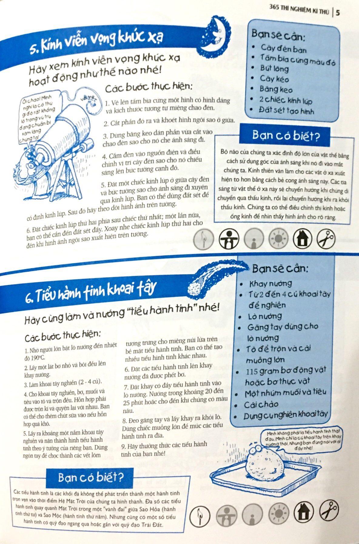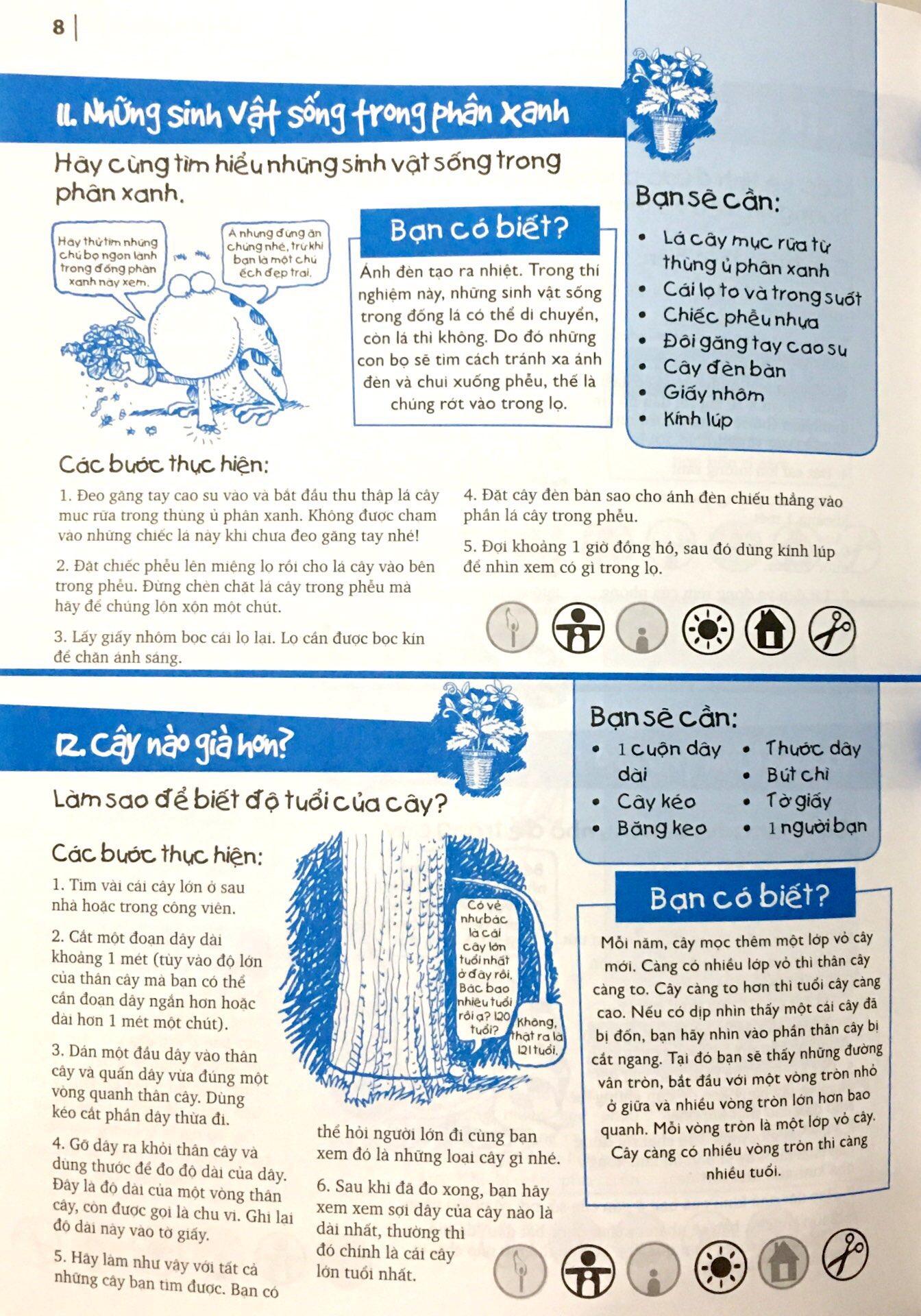 Tác giả luôn ghi chú ở phần đầu mỗi thí nghiệm những dụng cụ cần thiết và nơi các em nên thực hiện thí nghiệm để tránh gây ảnh hưởng đến mọi người và lưu ý những thí nghiệm nào thì cần sự hỗ trợ từ người lớn. Các thí nghiệm được minh họa rõ ràng từng bước giúp các em dễ dàng thao tác mà vẫn đảm bảo an toàn.