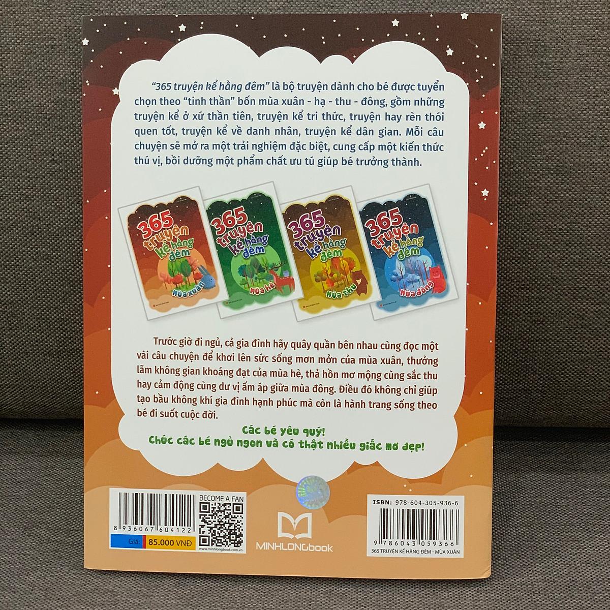 365 truyện kể hằng đêm là bộ truyện thiếu nhi được phân chia chủ đề theo các mùa trong năm: xuân, hạ, thu, đông. Ở mỗi tập truyện, các bạn nhỏ sẽ được chìm đắm trong thế giới li kì của Truyện kể xứ thần tiên; thu nhận được nhiều điều bổ ích, lí thú trong phần Truyện kể tri thức; học được nhiều điều hay lẽ phải qua những Câu chuyện về thói quen tốt và đức tính tốt; mở mang tầm hiểu biết qua Truyện kể danh nhân; thả hồn bay bổng trong mỗi Truyện kể dân gian.