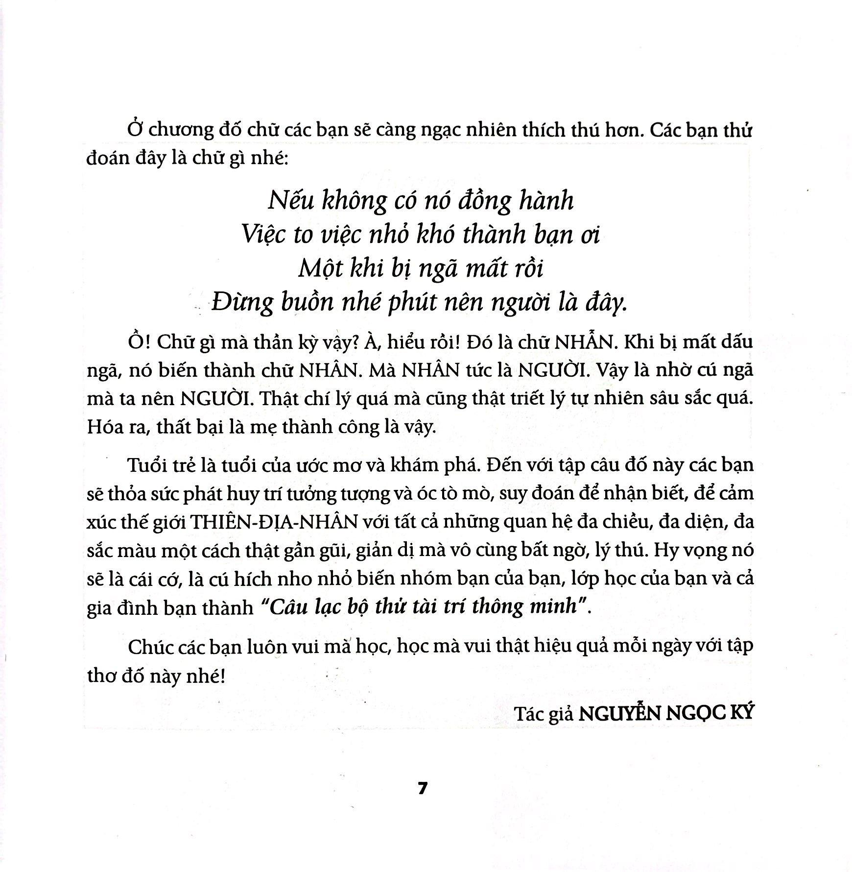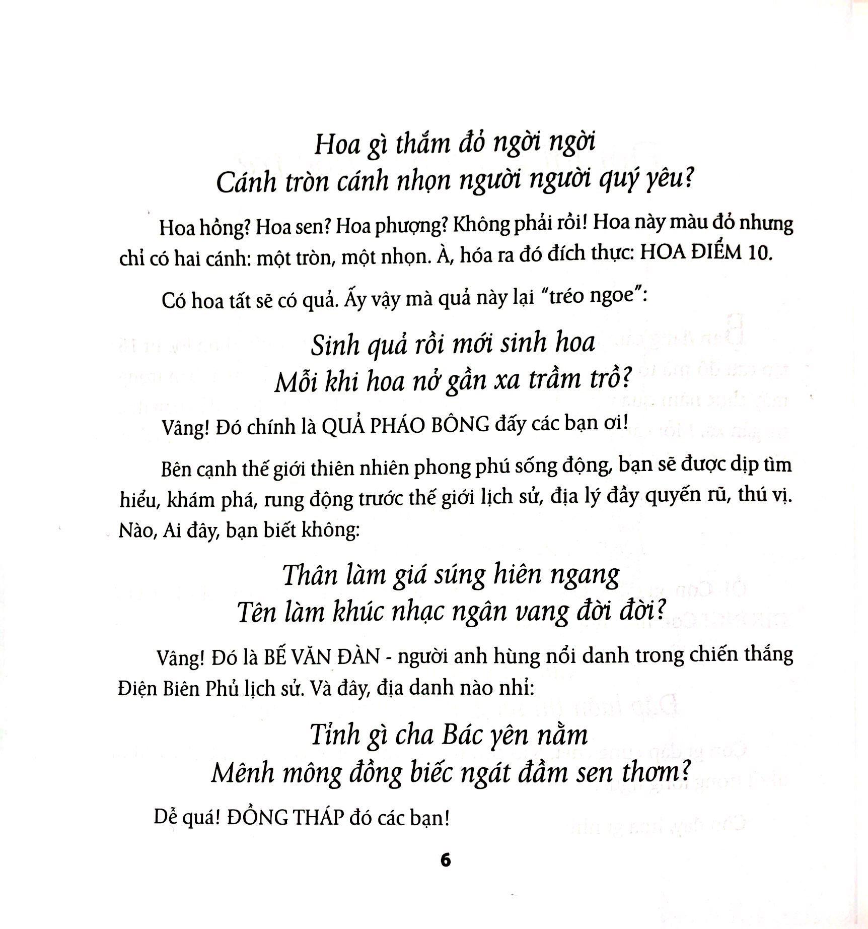 Cuốn sách gồm 18 chương, đề cập đến những chủ đề hết sức phong phú và đa dạng: về các loài hoa, các con vật, các loài cá, các tỉnh thành trong nước hay về các danh nhân trong lịch sử… Mỗi chủ đề giống như một bài thơ dài, trong đó phản ánh một cách sinh động bản chất của đối tượng mà câu đố đang đề cập đến. Đối tượng đó không ở đâu xa, mà ở ngay trong cuộc sống của các bạn nhỏ: là lá, hoa, cây cối, chim muông, là bánh trái, các vật dụng… Bên cạnh thế giới thiên nhiên phong phú sống động, các bạn nhỏ sẽ được dịp tìm hiểu, khám phá, rung động trước thế giới lịch sử, địa lý đầy quyến rũ, thú vị.