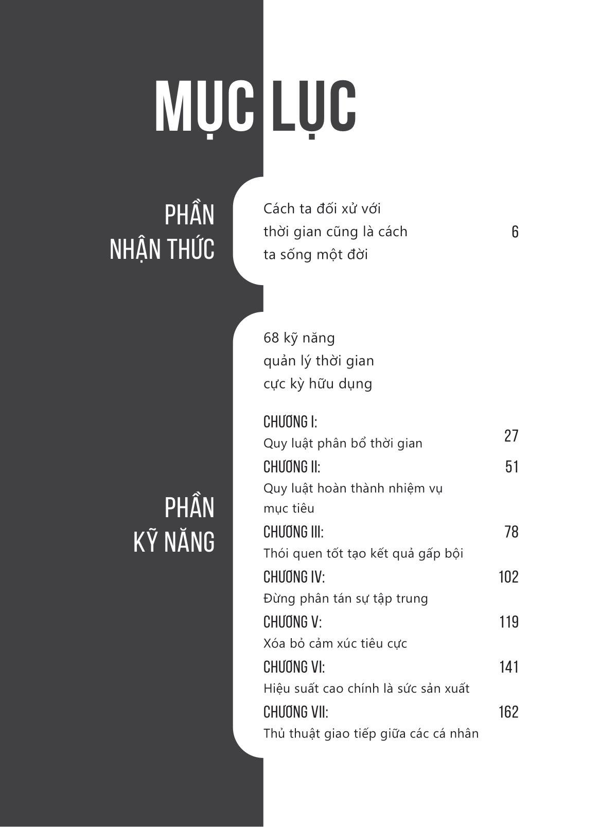 Phần kỹ năng, chủ yếu bao gồm các phương pháp hữu ích để phân bổ thời gian, quản lý mục tiêu đã được kiểm chứng qua thực tiễn và có hiệu quả ở bảy khía cạnh: hình thành thói quen, sự tập trung, cảm xúc, tâm lý, hiệu quả công việc và giao tiếp giữa các cá nhân. Miễn là những phương pháp và kỹ thuật này được sử dụng đúng cách, bạn có thể kiểm soát thời gian cá nhân, mang lại những thay đổi chấn động trong công việc và cuộc sống của bản thân.