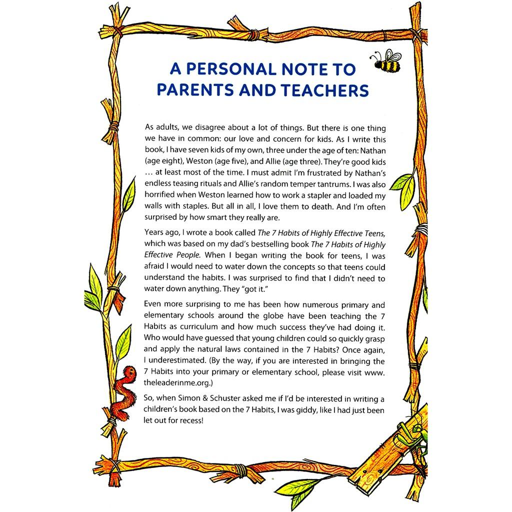7 thói quen để trẻ hạnh phúc là những câu chuyện hài hước lý thú mà tác giả Sean Covey đã khéo sáng tạo và lồng ghép các bài học thực tế vào trong lời thoại của các nhân vật Gấu Goob, Sóc Sophie - Sean Covey từng tâm sự rằng ông viết 7 thói quen để trẻ hạnh phúc cũng là để dạy 3 đứa con mình: Nathan 8 tuổi, Weston 5 tuổi và Allie 3 tuổi. Đây cũng chính là những bài học thực tế giúp các phụ huynh hiểu và đồng hành cùng con trong quá trình nuôi dưỡng và trưởng thành trở thành người hạnh phúc.