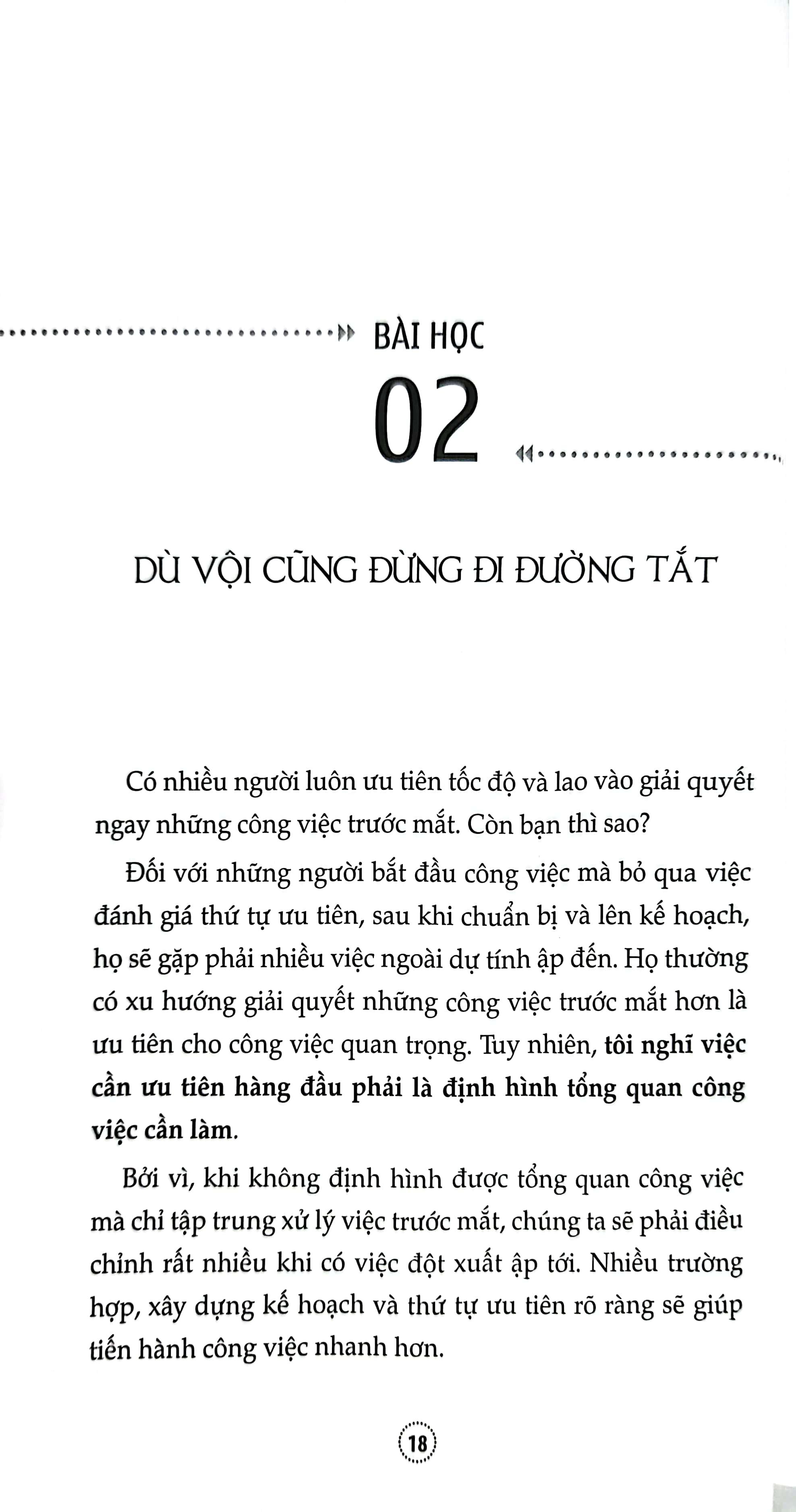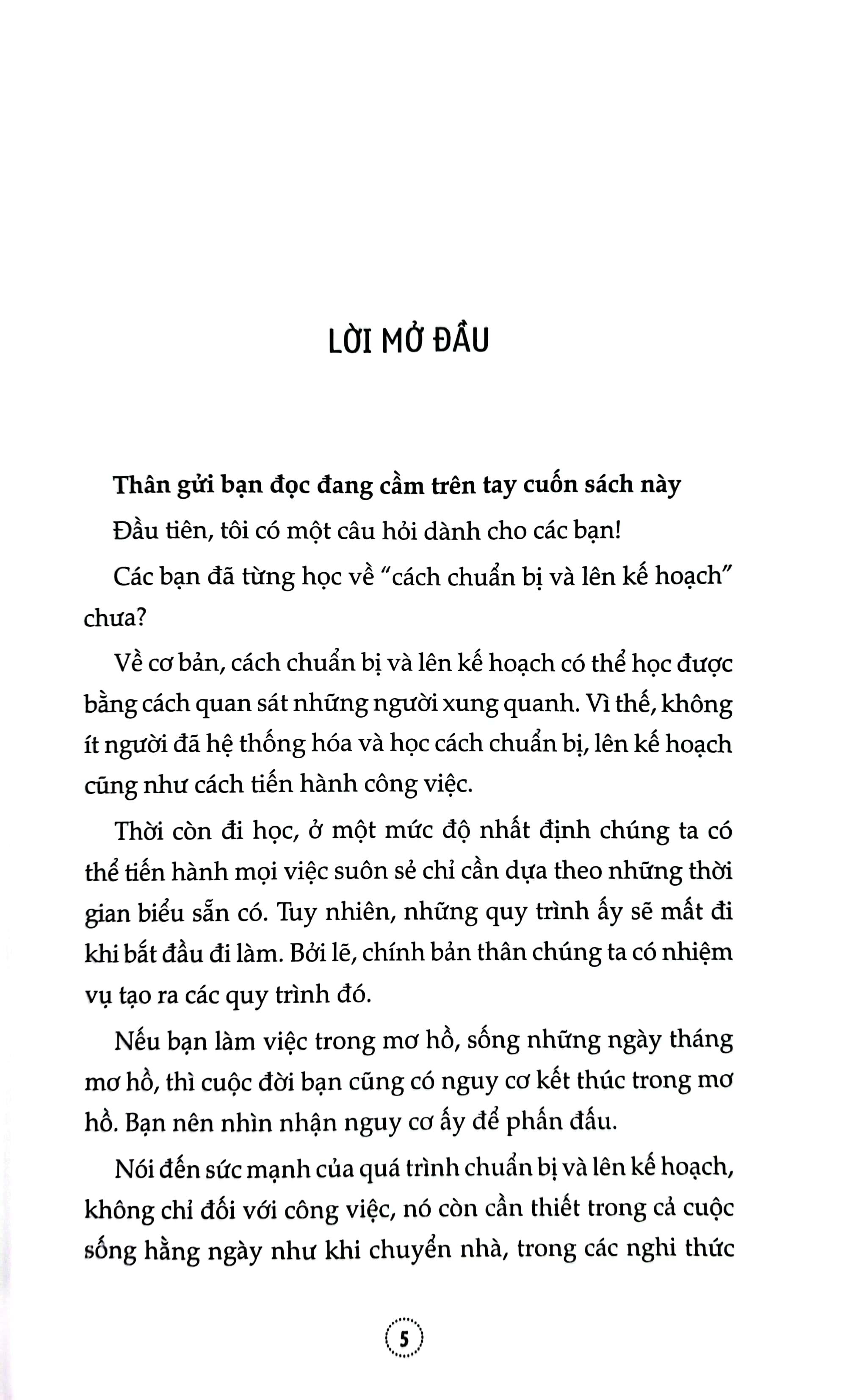• Và giảng dạy tại nhiều trường đại học. Nếu bạn làm việc trong mơ hồ, sống những ngày tháng mơ hồ, thì cuộc đời bạn cũng có nguy cơ kết thúc trong mơ hồ. Bạn nên nhìn nhận nguy cơ ấy để phấn đấu. Thời còn đi học, ở một mức độ nhất định chúng ta có thể tiến hành mọi việc suôn sẻ chỉ cần dựa theo những thời gian biểu sẵn có. Tuy nhiên, những quy trình ấy sẽ mất đi khi bắt đầu đi làm. Bởi lẽ, chính bản thân chúng ta có nhiệm vụ tạo ra các quy trình đó. Nói đến sức mạnh của quá trình chuẩn bị và lên kế hoạch, không chỉ đối với công việc, nó còn cần thiết trong cả cuộc sống hằng ngày như khi chuyển nhà, trong các nghi thức quan trọng như kết hôn, tang lễ hay giỗ chạp, cho đến các môn thể thao như bóng chày, bóng đá. Chắc các bạn cũng đã từng có kinh nghiệm đến tham dự những buổi tiệc mà người chủ trì vụng về trong khâu chuẩn bị và lên kế hoạch đúng không? Tại nơi làm việc, dù bạn đang nắm giữ bất kỳ chức vụ hay đang đảm nhiệm công việc nào như bán hàng, lên kế hoạch hay tổng hợp, thì cũng cần kỹ năng phác thảo trước toàn bộ công việc để tiến hành suôn sẻ. Sản xuất, IT, tài chính, bất động sản, dịch vụ, hay bất cứ lĩnh vực kinh doanh nào khác cũng giống như vậy. Có thể nói chuẩn bị và lên kế hoạch là kỹ năng nền tảng mà người nào đi làm cũng cần trang bị cho bản thân. Tại các công ty, Những người kém kỹ năng này thường dễ bị gắn mác là trời sinh ra đã “dốt sẵn”, “tầm nhìn hạn hẹp”. Nhưng bằng việc rèn luyện, mỗi ngày chịu khó quan sát và hành động, chắc chắn thành quả sẽ tăng lên. Về cơ bản, cách chuẩn bị và lên kế hoạch có thể học được bằng cách quan sát những người xung quanh. Vì thế, không ít người đã hệ thống hóa và học cách chuẩn bị, lên kế hoạch cũng như cách tiến hành công việc. Vậy nên, trong cuốn sách này, tác giả đã chủ ý sắp xếp, kết hợp những ví dụ thực tế của bản thân cùng nhiều hình ảnh minh họa để hỗ trợ cho các độc giả trong việc hoàn thiện kỹ năng này. Nhà xuất bản và tác giả hy vọng các độc giả có thể vừa đọc vừa liên hệ với bản thân, suy ngẫm về những trường hợp cụ thể có thể áp dụng trong cuộc sống, kiểu như “cách làm này có vẻ áp dụng được cho công việc của m.ình!”, hay “m.ình sẽ thử bắt đầu cho đứa em cùng bộ phận!”. Nghệ thuật chuẩn bị và sắp xếp công việc - 77 thói quen làm việc hiệu quả giúp bạn có thêm những kĩ năng cần thiết để phát triển tư duy và hoàn thành tốt công việc. Nghệ thuật quản lý thời gian hiệu quả Nghệ thuật tăng tốc công việc Nghệ thuật triển khai dự án hiệu quả Nghệ thuật thúc đẩy động lực làm việc Nghệ thuật nâng cao năng lực tư duy Nghệ thuật sử dụng công cụ hiệu quả Nội dung chi tiết: Chương 1: NGHỆ THUẬT QUẢN LÝ THỜI GIAN HIỆU QUẢ Bài học 01: Tạo khoảng thời gian tập trung, loại bỏ triệt để những yếu tố cản trở công việc Bài học 02: Dù vội cũng đừng đi đường tắt Bài học 03: Thiết lập thời gian tiêu chuẩn Bài học 04: Mua thời gian! Bài học 05: Thiết lập kỳ hạn cho từng công việc Bài học 06: Đừng bao giờ nói “Tôi bận” Bài học 07: Bí quyết nâng cao hiệu suất - “tiến hành đồng thời” Bài học 08: Trở thành nhân viên không làm thêm giờ Bài học 09: Công việc không cần kết quả hoàn hảo, chỉ cần hoàn thành “đại khái” Bài học 10: Người chuẩn bị tốt sẽ huy động được người khác làm cùng Bài học 11: Thoải mái làm việc để tạo ra thành quả lớn! Bài học 12: Trước cuộc họp hay buổi thương thảo, hãy gửi với nội dung “Ngày mai mong anh giúp đỡ” sẽ tạo được hiệu quả Chương 2: NGHỆ THUẬT TĂNG TỐC CÔNG VIỆC Bài học 01: “Hãy coi trọng thời gian, dù chỉ 5 phút” Bài học 02: Dừng việc gửi mail từng li từng tí lại. Hãy gọi điện thoại ngay tức khắc Bài học 03: Thời gian có thể tập trung, công việc có thể tập trung Bài học 04: Phải cần cù xúc tiến công việc từng bước một Bài học 05: Bắt tay làm từ những việc đơn giản và có hiệu quả Bài học 06: Không nên nhầm lẫn công việc nên làm với công việc cần phải làm Bài học 07: Xử lý trước các công việc nhỏ nhặt! Bài học 08: Đừng đặt mục tiêu làm một lần OK luôn Bài học 09: Đừng để bị cấp trên sử dụng, hãy sử dụng cấp trên Bài học 10: Hãy mạnh dạn từ bỏ công việc! Bài học 11: Xác nhận ngay tại cuộc họp! Bài học 12: Càng những công việc cảm thấy xấu hổ, càng phải xử lý sớm! Bài học 13: Chia nhỏ công việc Bài học 14: Quy tắc Ho-ren-so Chương 3: NGHỆ THUẬT TRIỂN KHAI DỰ ÁN HIỆU QUẢ Bài học 01: Hãy viết ra những việc ngày mai bạn phải làm Bài học 02: Đừng làm những công việc “làm cho xong”! Bài học 03: Hãy nghĩ cách chia nhỏ con đường dẫn đến đích! Bài học 04: Hãy nắm rõ những người liên quan xung quanh! Bài học 05: Phương pháp biến những người xung qua