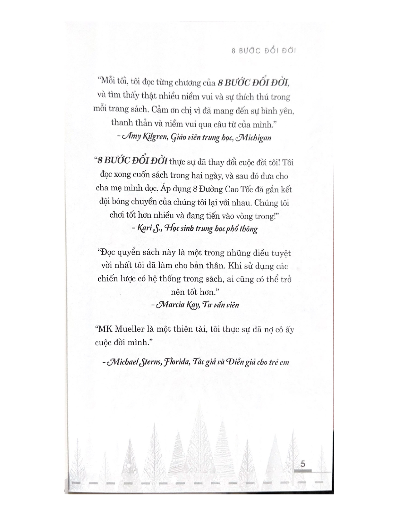 - Giới thiệu 8 Bước Đổi Đời - 8 To Great Trong 8 BƯỚC ĐỔI ĐỜI, tác giả MK Mueller trình bày 8 bước cơ bản mà những người hạnh phúc, khỏe mạnh và thành công nhất đều áp dụng. Sách dựa trên quá trình 8 bước giúp mọi người theo đuổi ước mơ - dù cho đó là giảm cân và giảm đường mà không lên cơn thèm, tìm được công việc mơ ước, tận hưởng mối quan hệ như mơ, nâng cao thành tích thể dục thể thao trong vài ngày, thoát nợ, hoặc giành được học bổng vào đại học. Cách tiếp cận 8 bước giúp kết nối thân-tâm-trí của tác giả được hình thành dựa trên những nguyên tắc sống mãi với thời gian như chịu trách nhiệm hoàn toàn, dám mạo hiểm, cảm nhận mọi cảm xúc và tha thứ cho quá khứ. Đây là cuốn sách chạm đến trái tim của người đọc và giúp thay đổi mỗi người từ trong ra ngoài.