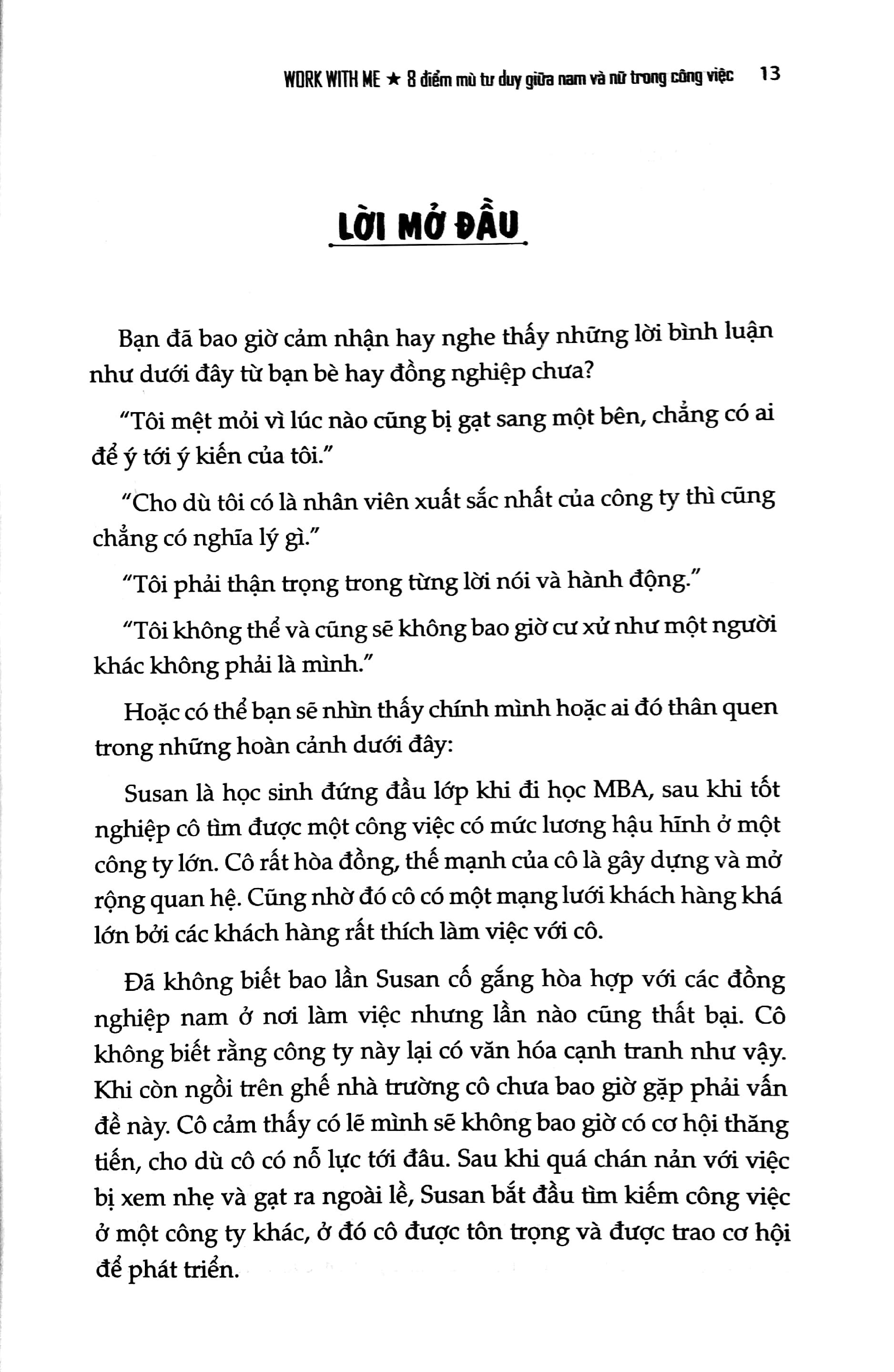 WORK WITH ME - 8 Điểm Mù Tư duy giữa nam và nữ trong công việc là cuốn sách khám phá về Giới, một chủ đề khá mới trong xã hội hiện đại. Từ lâu, trong các mối quan hệ giữa đàn ông và phụ nữ luôn có những điểm khác biệt dẫn đến những sự phân công lao động khác nhau cũng như những “định kiến Giới” khiến mỗi giới không phát huy hết được những tiềm năng và thế mạnh của bản thân mình. Từ đó tạo nên những khoảng cách và quan niệm bất bình đẳng, đặc biệt trong công việc. Nhiều người cảm thấy bế tắc, chán chường, muốn bỏ cuộc vì họ không thể hòa hợp được với người khác giới trong công việc.