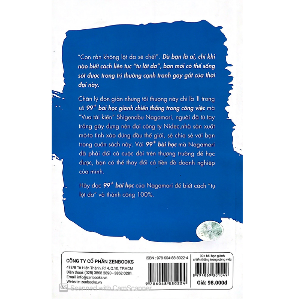 “Con rắn không lột da sẽ chết”. Dù bạn là ai, chỉ khi nào biết cách liên tục “tự lột da”, bạn mới có thể sống sót được trong thị trường cạnh tranh gay gắt của thời đại này. Chân lý đơn giản nhưng tối thượng này chỉ là 1 trong số 99+ bài học giành chiến thắng trong công việc mà “Vua tái kiến” Shigenobu Nagamori, người đã từ tay trắng gầy dựng nên đại công ty Nidec, nhà sản xuất mô-tơ tinh xảo đứng đầu thế giới, sẽ chia sẻ với bạn trong cuốn sách này. Với 99+ bài học mà Nagamori đã phải đổi cả cuộc đời trên thương trường để học được, bạn có thể thay đổi cả tiền đồ doanh nghiệp của mình. Hãy đọc 99+ bài học của Nagamori để biết cách “tự lột da” và thành công bạn nhé!