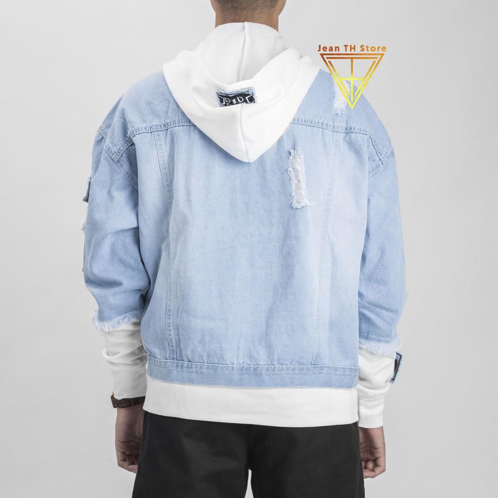 ✨Áo khoác jean xanh phối nón nỉ trắng cao cấp, áo khoác bò phối mũ trẻ trung năng động