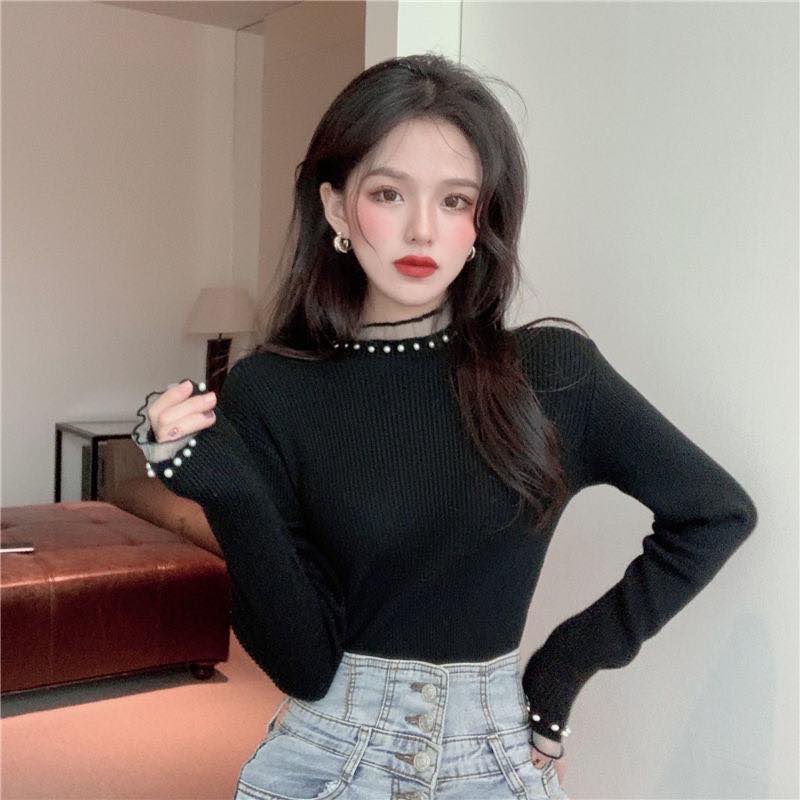 ✨Áo len cổ lọ ren đính ngọc thời trang gợi cảm cho nữ