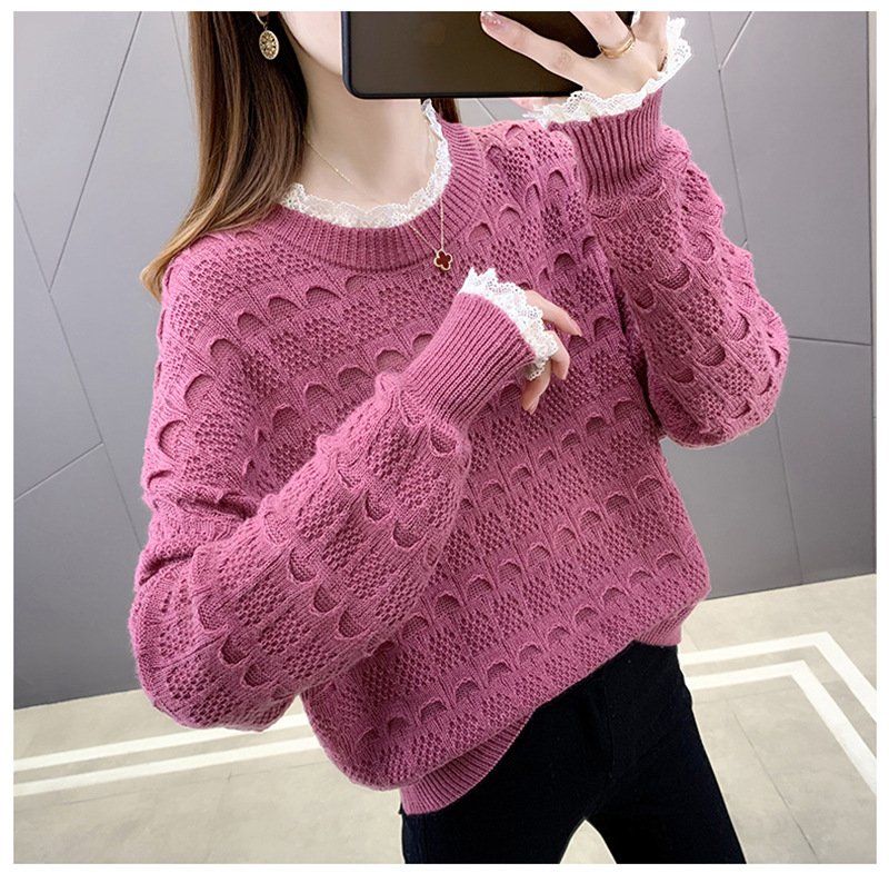 Áo len nữ dài tay cổ tròn đan rỗng kẻ ô
