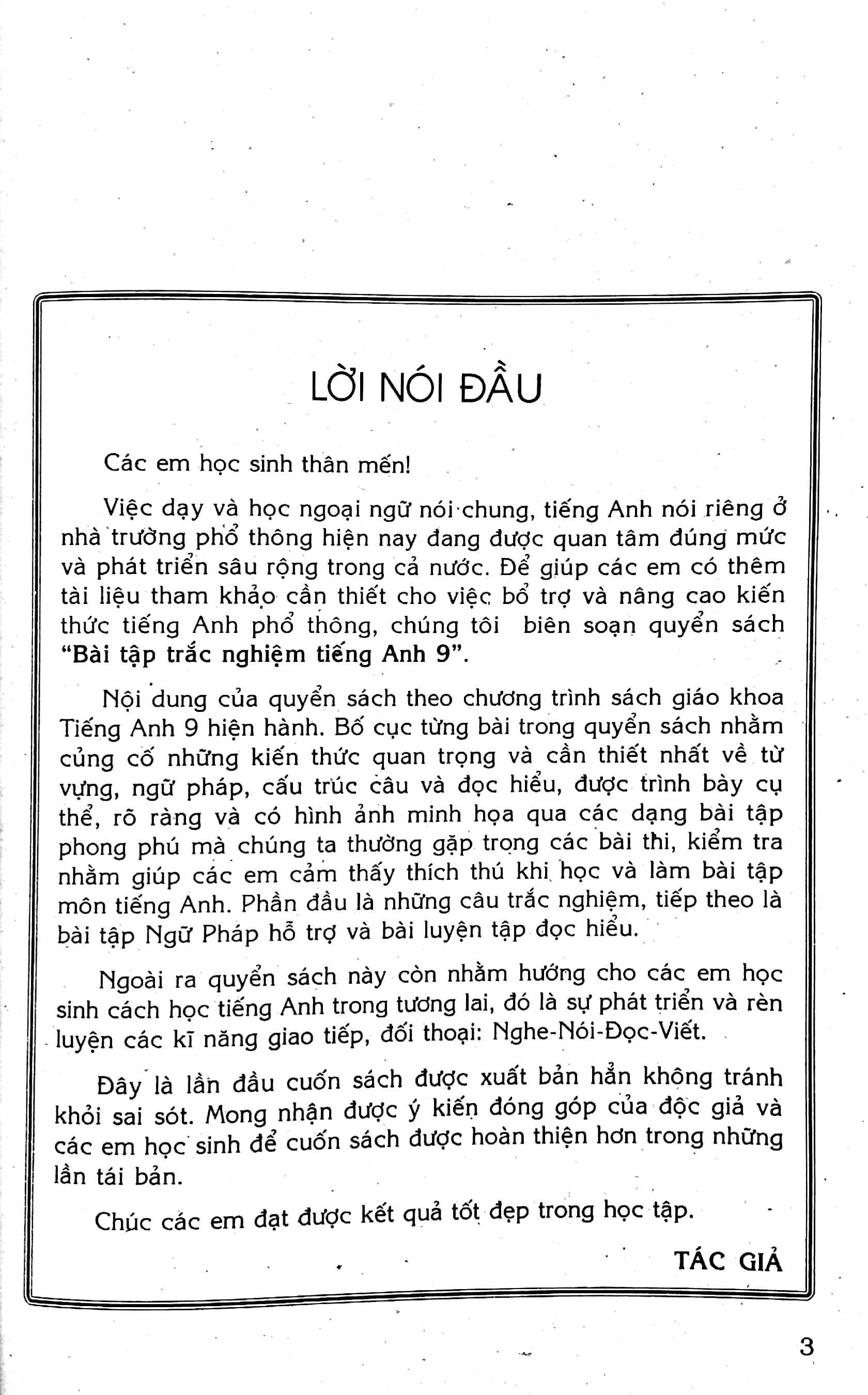 Việc dạy và học ngoại ngữ nói chung, tiếng Anh nói riêng ở nhà trường phổ thông hiện nay đang được quan tâm đúng mức và phát triển sâu rộng trong cả nước. Để giúp các em có thêm tài liệu tham khảo cần thiết cho việc bổ trợ và nâng cao kiến thức tiếng Anh phổ thông, chúng tôi biên soạn quyển sách “Bài tập trắc nghiệm tiếng Anh 9”.