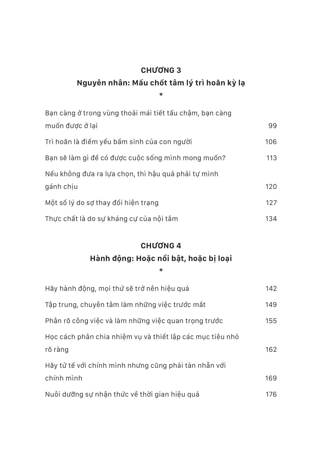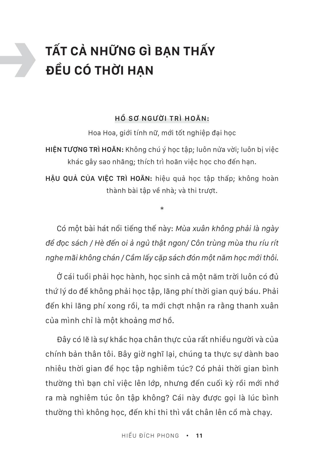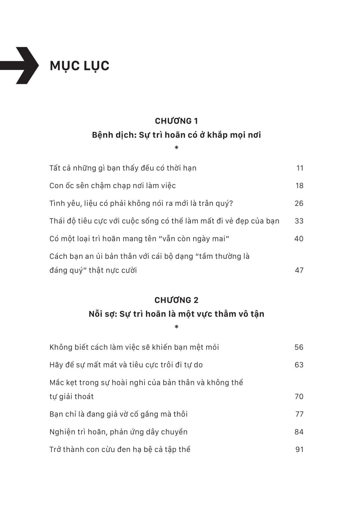 Bạn có từng cảm thấy dường như m.ình sở hữu thời gian vô biên nhưng lại không đủ thời gian cho mọi việc, luôn bận rộn và mệt mỏi nhưng hiếm khi biết rõ m.ình đang làm gì, cứ thế mông lung tiến về tương lai? Bạn đã từng thử thách bản thân hoàn thành công việc sát hạn chót để rồi tự hào rằng "áp lực tạo ra kim cương", m.ình đã lầy lội thế rồi mà vẫn xong việc, m.ình phải giỏi lắm thì mới gấp rút được như thế? Nếu gặp triệu chứng trên, hẳn là bạn đã mắc phải căn bệnh trì hoãn rồi.