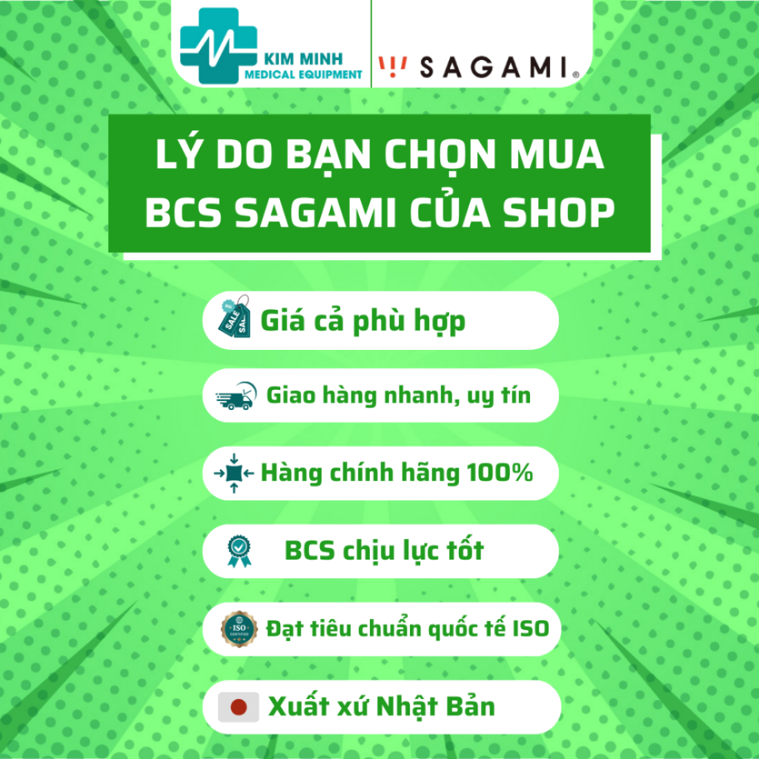 THIẾT BỊ Y TẾ KIM MINH xin kính chào Quý khách Thiết bị Y tế Kim Minh cam kết bán hàng CHÍNH HÃNG. Nói không với hàng giả, kém chất lượng. BCS Sagami do thiết