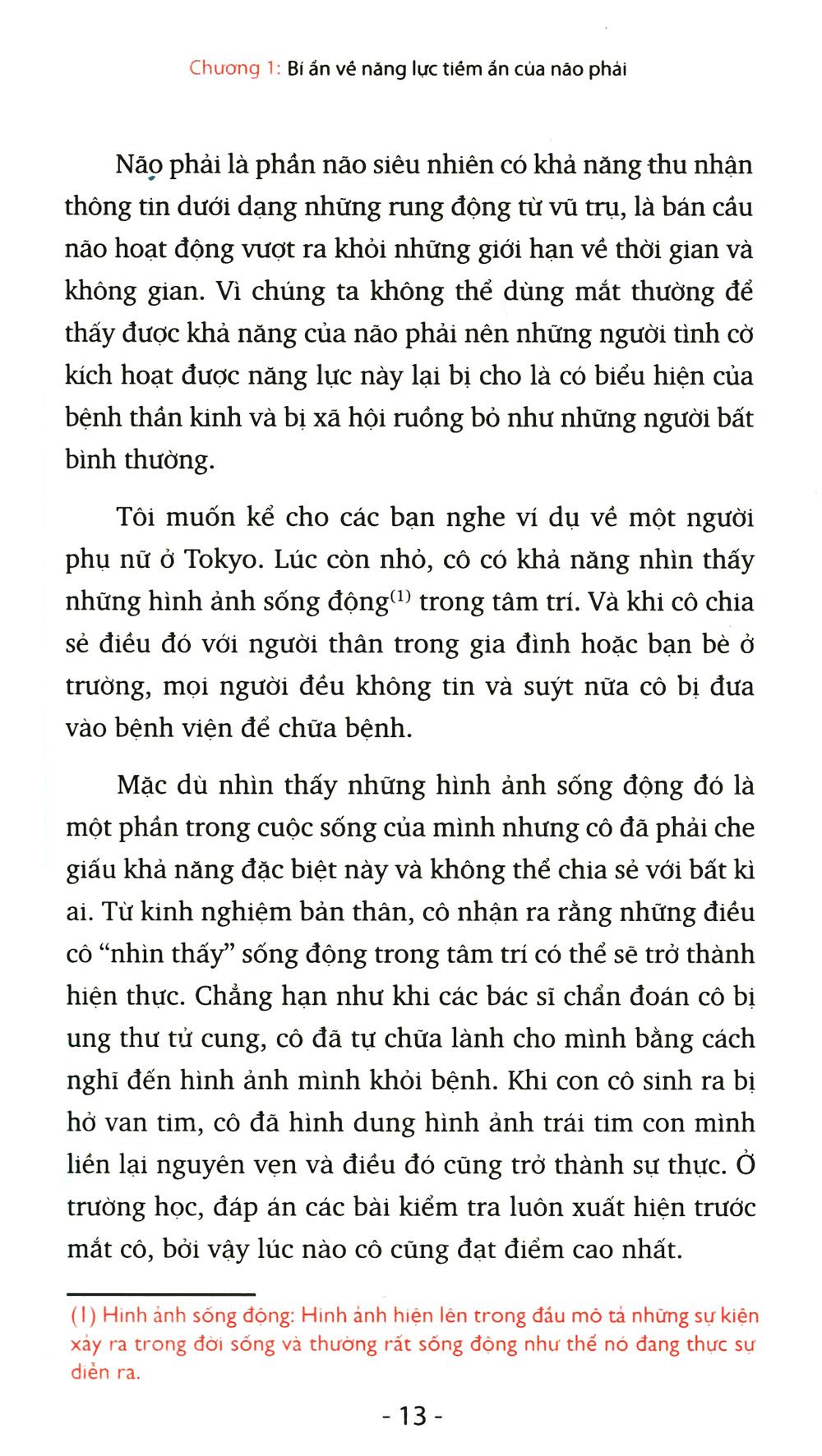 Qua đó cuốn sách cũng kết hợp nhiều câu chuyện thực tế mà các bé đã được giáo dục qua phương pháp Shichida “Bí Ẩn Của Não Phải” đem đến một triết lí giáo dục lành mạnh, nhân văn mà vẫn rất kỉ luật, nghiêm khắc. Ngoài phần nội dung ra cuốn sách còn có những hình ảnh cụ thể, sinh động, dễ hiểu cùng với những câu chuyện thực tế mà giáo viên tại học viện Shichida đã kể lại rằng: “Ông nội của T mắc bệnh ung thư. Cậu bé nghe được điều này khi bác sĩ giải thích tình trạng bệnh của ông với mẹ. T có khả năng chữa lành cho người khác thông qua việc tưởng tượng mình biến thành một người tí hon và đi vào trong cơ thể của họ để chữa lành những bộ phận bị đau. Mỗi lần đến thăm ông trong bệnh viện, T đều tưởng tượng mình đang đi vào cơ thể của ông và tiêu diệt hết vi khuẩn. Các tế bào ung thư nhỏ lại dần dần. Em T đã làm như vậy không chỉ cho ông nội mà còn cho các bệnh nhân khác trong cùng phòng và thậm chí một số bệnh nhân bị ốm nặng, thật ngạc nhiên khi tất cả những người đó đã đủ khỏe để trở về nhà”.