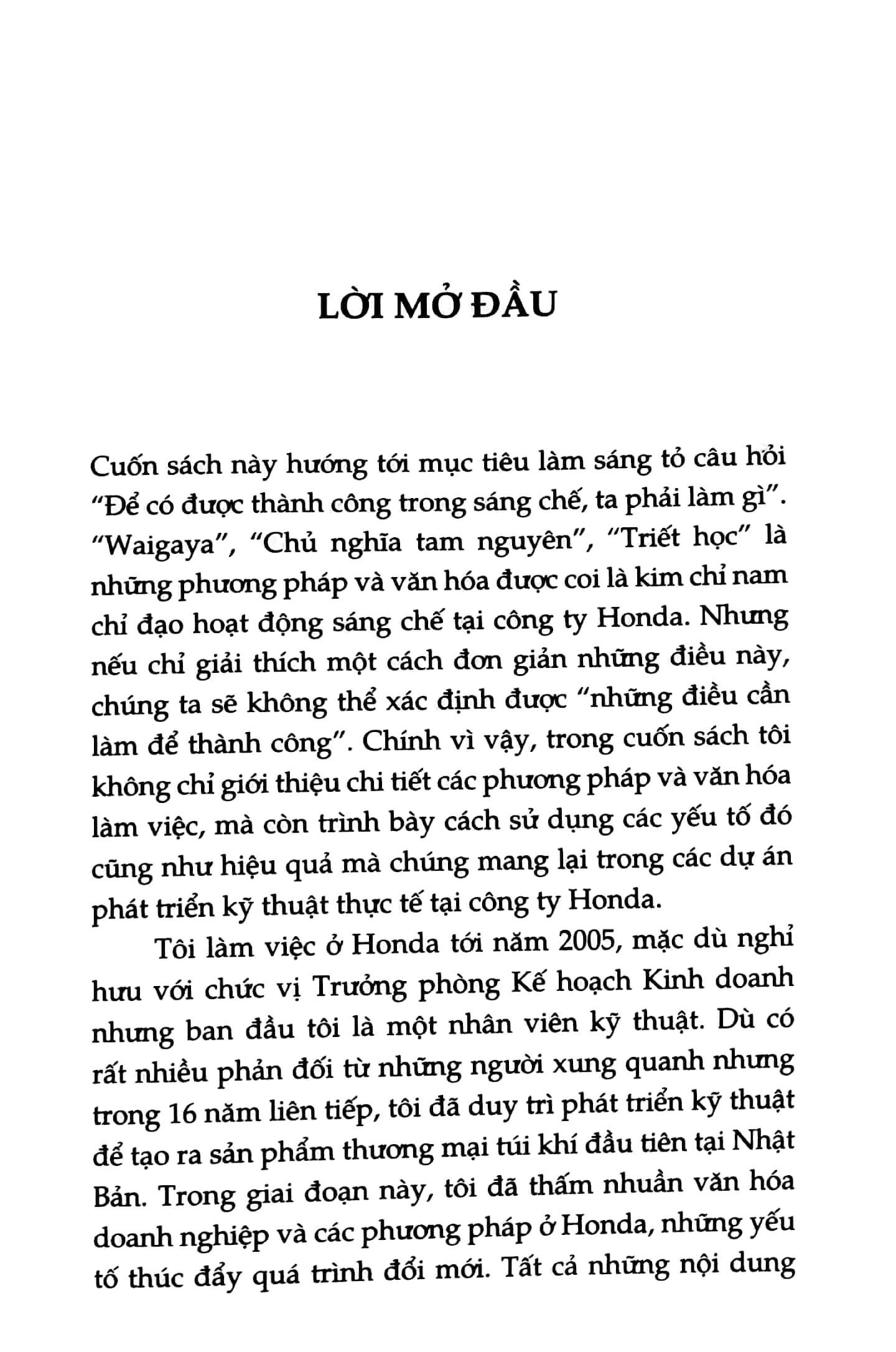 Honda đã đề xướng và duy trì triết lý và văn hóa riêng để tạo ra một môi trường thúc đẩy sáng tạo như: “Ba niềm vui”, “Tôn trọng con người”, “Waigaya”... Giống như khái niệm “waigaya” mà bạn đọc sẽ tìm hiểu qua từng trang sách, được coi là “con đường suy nghĩ dấn thân”, thì sáng tạo cũng vậy, một con đường dấn thân mà nếu không có tâm huyết và ý chí, người ta không thể vượt qua những kẻ ngáng đường, qua quãng thời gian dài làm người ta thoái chí cùng một tỉ lệ thành công thấp tới mức nản lòng, để đi tới tận cùng.
