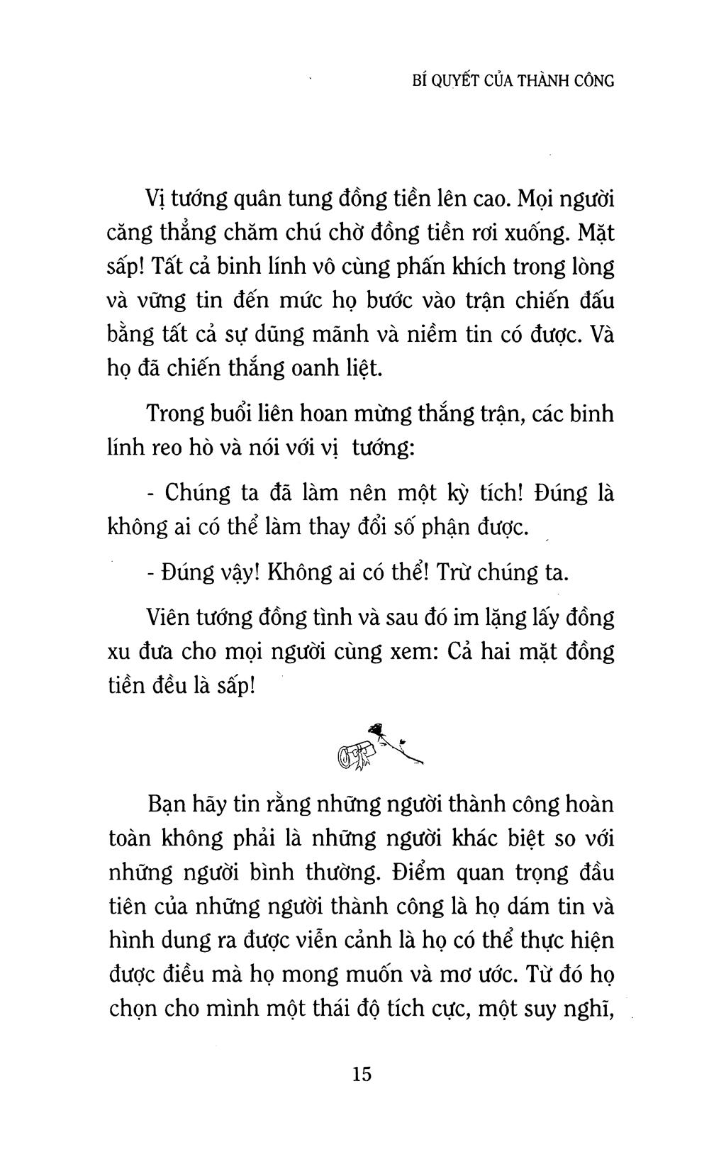 Bí quyết của thành công không phải là những gì xa lạ và khó thực hiện, đòi hỏi phải rèn luyện công phu trong nhiều năm trời mới có được. Cuốn sách không đưa ra những điều cao siêu hay đặt ra những mục tiêu lớn lao vượt khỏi khả năng của mỗi người. Mà chỉ đơn giản là những thái độ sống, những suy nghĩ tích cực, những điều khuyên thực tế mà bạn có thể áp dụng ngay vào lúc này – bất kể hoàn cảnh và tình trạng hiện có của bạn.