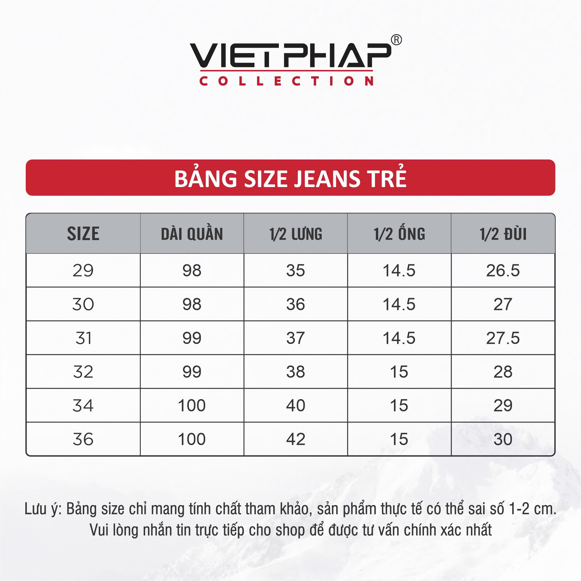 - Đổi trả hàng theo đúng quy định của Tiki VietPhap Collection Sản xuất tại: CTY TNHH May Mặc – Thời Trang Việt Pháp Cùng bạn làm nên phong cách! LƯU Ý: - Bảng size chart chỉ mang tính chất tham khảo, tùy thuộc vào số đo cơ thể mỗi người và chất liệu vải khác nhau sẽ có sự chênh lệch nhất định từ 1 - 2cm.