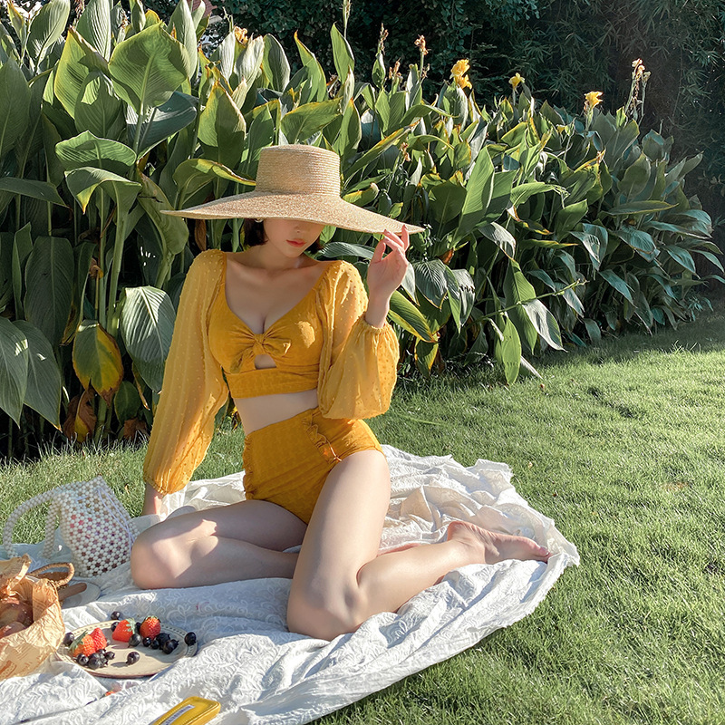 Set Đồ Bơi Nữ Rời Đùi Dài Tay Đi Biển Đi Bơi Chất liệu Polyester 88%, mật độ dệt vừa Áo có sẵn lớp đệm, hông áo có thể rút lên làm croptop cá tính