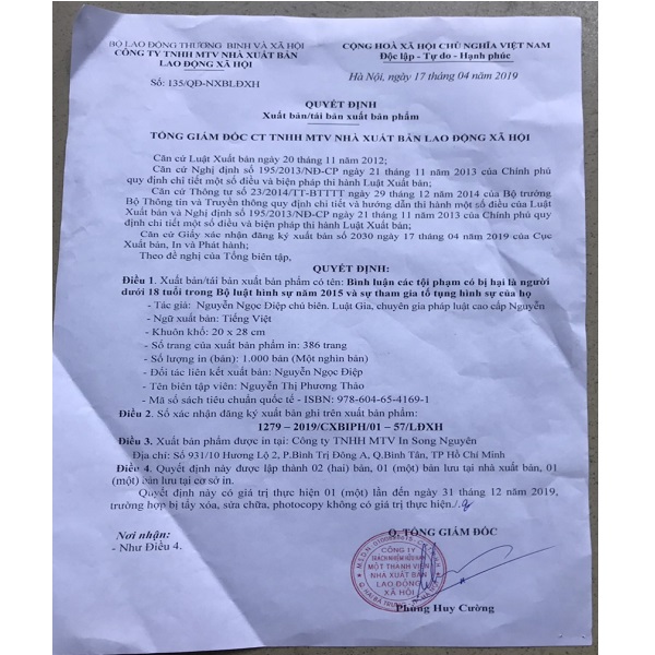 Nhằm giúp bạn đọc nói chung, những người làm công tác pháp luật nói riêng, tìm hiểu và năm vững các quy định của Bộ luật Hình sự và Bộ luật Tố tụng hình sự về người chưa thành niên là người bị hại, Nhà xuất bản Lao Động – Xã Hội cho xuất bản cuốn sách: Bình Luận Các Tội Phạm Có Bị Hại Là Người Dưới 18 Tuổi Trong Bộ Luật Hình Sự Năm 2015 Và Sự Tham Gia Tố Tụng Hình Sự Của Họ  Sách do Luật gia, chuyên gia pháp luật cao cấp Nguyễn Ngọc Điệp biên soạn. Ngoài ra, phần phụ lục cuốn sách còn in các văn bản hướng dẫn thi hành Bộ luật hình sự mới nhất để bạn đọc tiện tra cứu và áp dụng khi cần thiết. Nội dung cuốn sách bao gồm: - PHẦN THỨ I: Bình luận các tội phạm có bị hại là người dưới 18 tuổi trong bộ luật hình sự năm 2015 được sửa đổi, bổ sung năm 2017 - PHẦN THỨ II: Sự tham gia tố tụng hình sự của bị hại là người dưới 18 tuổi -PHẦN THỨ III: Các văn bản hướng dẫn thi hành bộ luật hình sự -PHẦN THỨ IV: Các quy định về thủ tục tố tụng hình sự đối với người dưới 18 tuổi -PHẦN THỨ IV: Các quy định về phòng xử án và quy chế tổ chức phiên tòa Hy vọng cuốn sách sẽ có giá trị hữu ích đối với bạn đọc. Sách đẹp, khổ 20*28 cm, dày 400 trang, Giá: 395.000đ. Nộp lưu chiểu quý II / 2019
