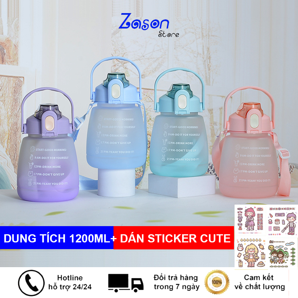 - Bình đựng nước dung tích bình có thể lên đến tận 1200 ml nước!!! Em đảm bảo mọi người không đầu tư thừa đâu vì việc uống nhiều nước mỗi ngày rất cần thiết cho chúng ta -Thiết kế bình đơn giản với các tông màu dễ thương, có phần thân trong suốt nhìn đẹp mắt, có in từng vạch dung tích bình.