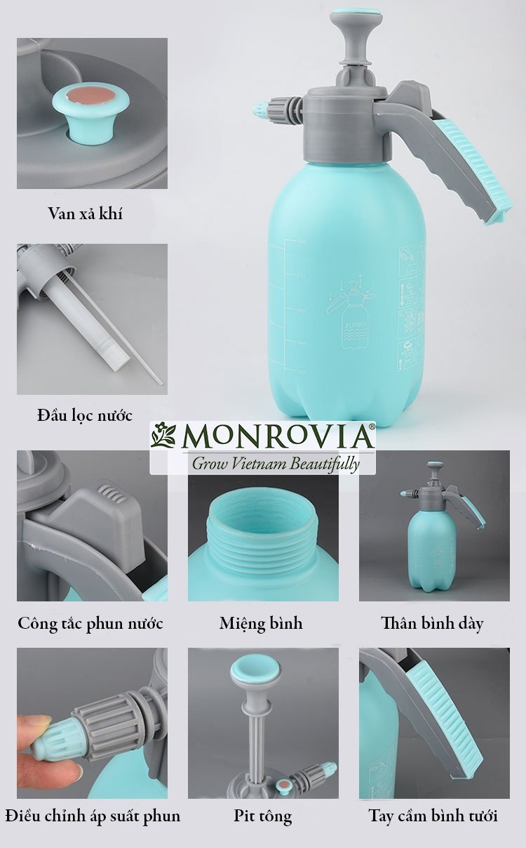 Bình xịt tưới cây Monrovia, 1 dòng sản phẩm hoàn toàn mới được nhập khẩu chính hãng bởi Monrovia Việt Nam. Đây là 1 trong những siêu phẩm được đón chờ nhất 2021. Sản phẩm nổi bật với thiết kế tinh tế, khả năng trữ và phun nước lên tới 2 lít. Ngoài ra, phần vòi phun với nhiều kiểu phun giúp các nhà làm vườn tìm thấy nhiều niềm vui hơn khi chăm hoa và cây cảnh. Thông tin Bình xịt tưới cây MONROVIA