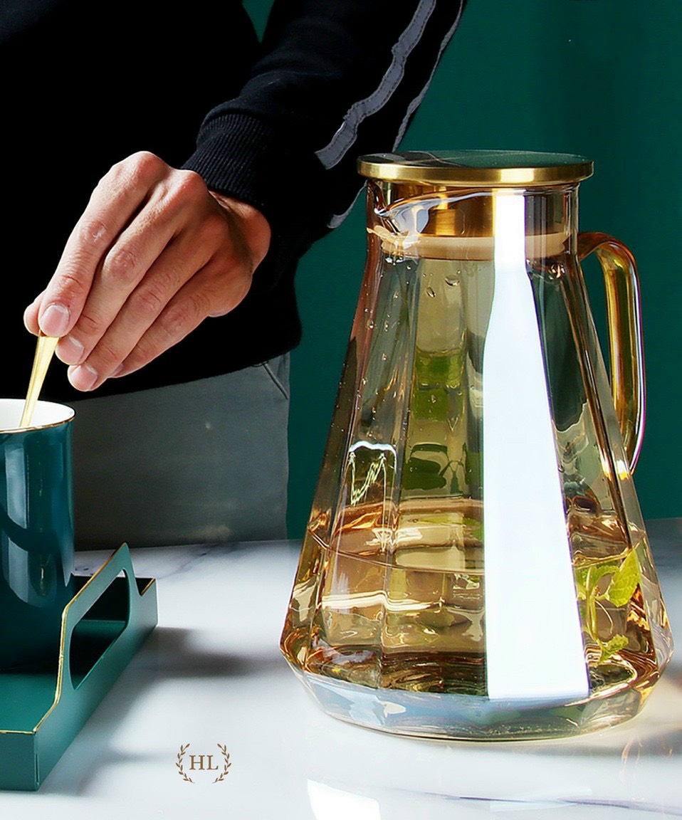 ✨BỘ BÌNH ĐỰNG NƯỚC UỐNG THỦY TINH KÈM 6 CỐC VÀNG SỌC VÀ GIÁ ÚP CỐC - VD106