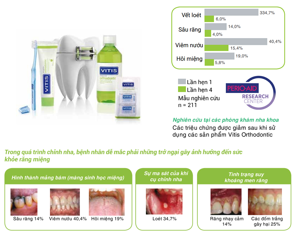 - Bộ kit Vitis Orthodontic với các thành phần hoạt tính và dụng cụ cần thiết hàng ngày giúp duy trì sức khỏe răng miệng lành mạnh, không mảng bám, nướu khỏe mạnh, hơi thở thơm mát, và ngăn ngừa sâu răng, giúp người đeo khí cụ chỉnh nha duy trì vệ sinh răng miệng hàng ngày.
