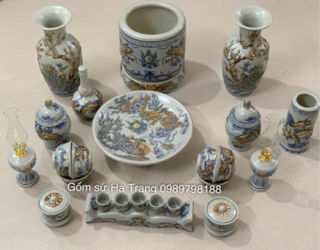 Bộ đồ thờ men rạn đắp nổi đầy đủ trông như thế nào. Đồ thờ gốm sứ Bát Tràng Hoàng Phát
