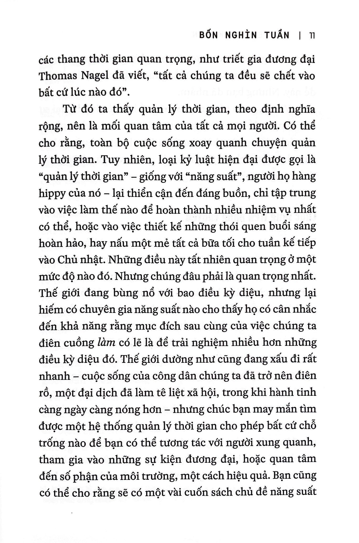 Không giống với những cuốn sách lời khuyên về năng suất và quản lý thời gian khác, với Bốn nghìn tuần, bằng cách tiếp cận thẳng thắn, chân thành, tác giả Oliver Burkeman đi vào phân tích và khám phá nỗi sợ hãi cố hữu về sự ngắn ngủi của kiếp người, đồng thời chỉ ra rằng chỉ bằng cách chấp nhận và đối mặt với những giới hạn của m.ình, chúng ta mới có thể thật sự sống một cuộc đời trọn vẹn.