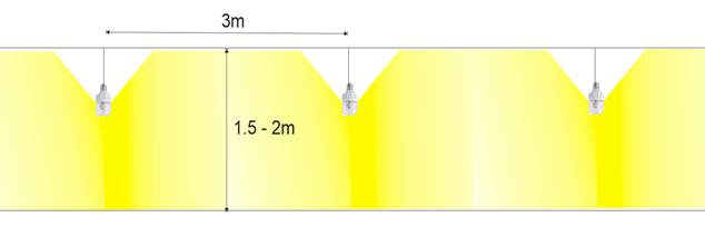- Mật độ bố trí đèn: 7÷9m2/đèn