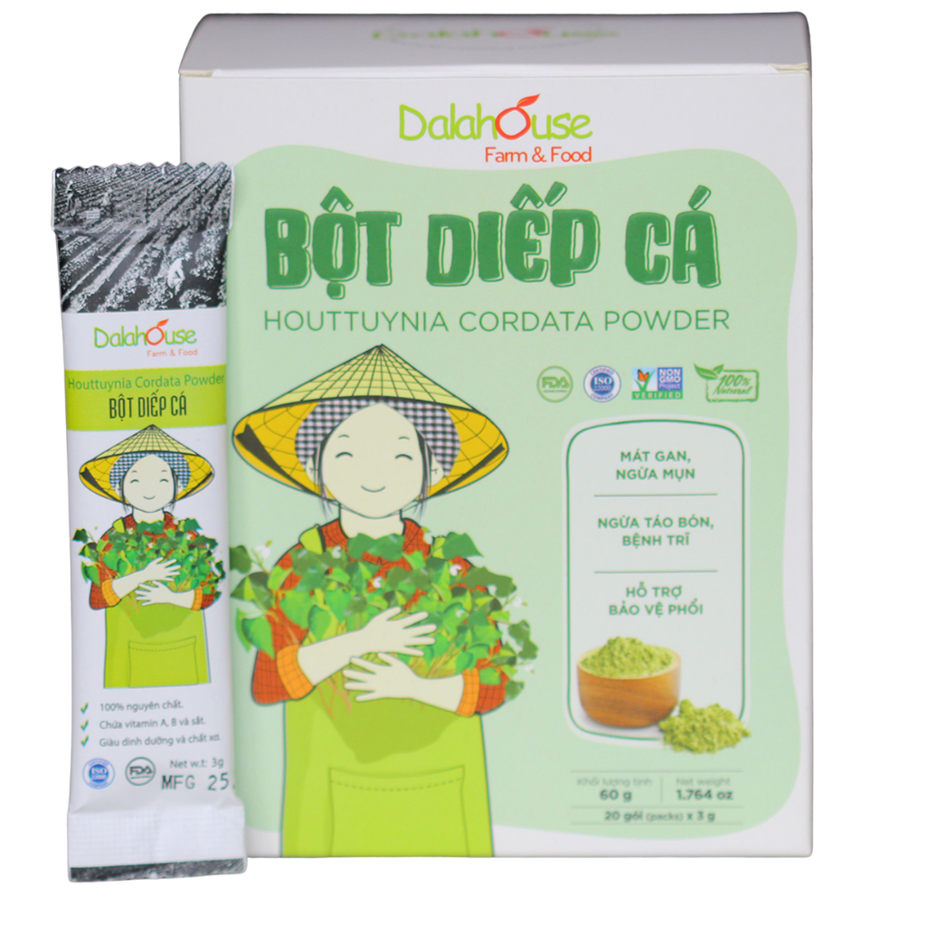 Dalahouse - Thương hiệu bột rau Việt đang có mặt trên Amazone Dalahouse - Đạt chứng nhận USDA (tiêu chuẩn nông sản hữu cơ (Organic) theo tiêu chuẩn Hoa Kỳ) Nguồn rau trồng tại Đà Lạt, nguyên liệu nhập khẩu từ Hoa Kỳ, trồng hoàn toàn tự nhiên, không sử dụng hóa chất Công nghệ sấy lạnh hiện đại, Giữ lại được hơn 90% dưỡng chất, vitamin, diệp lục tố và 100% chất sơ từ rau Thời gian bảo quản lâu hơn và không bị mất dinh dưỡng theo thời gian như rau tươi Đã được tiệt trùng nên loại bỏ hoàn toàn nguy cơ nhiễm giun sán ký sinh trùng Dễ dàng mang theo, dùng thay thế rau tươi Tiện dụng, dễ sử dụng, dùng làm thức uống hàng ngày, bột dinh dưỡng cho trẻ em, nguyên liệu nấu cháo, súp, làm bánh, làm đẹp (đắp mặt) 100% nguyên chất, không chất bảo quản, không chất tạo màu Hỗ trợ điều trị bệnh trĩ, thải độc cơ thể hoàn toàn tự nhiên UỐNG NƯỚC BỘT DIẾP CÁ CÓ TÁC DỤNG GÌ ? Theo bác sĩ  Paul Haider – một thạc sĩ về dược liệu người Mỹ nổi tiếng chăm sóc sức khỏe bằng các loại thảo dược nói rằng : Bột diếp cá là loại thảo dược thần kỳ cải thiện sức khỏe và giúp lành hầu hết mọi thứ.Thường xuyên uống nước bột diếp cá sẽ giúp bạn có 1 cơ thể hoàn toàn khỏe mạnh. 1/Giúp tạo ra nhiều men vi sinh hơn  Quá trình lên men của loại thảo dược này trong cơ thể giúp phát triển nhiều vi khuẩn có lợi hơn trong ruột do đó cải thiện đáng kể hệ thống miễn dịch của chúng ta. Bột diếp cá ngăn vi khuẩn xấu xâm nhập và giúp vi khuẩn tốt phát triển mạnh. 2/Một lượng lớn chất chống oxy hóa Bột rau diếp cá chứa một lượng lớn chất chống oxy hóa mạnh mẽ bao gồm rutin và quercetin. Điều này giúp ngăn ngừa tổn thương và chữa lành DNA và do đó giúp cơ thể ngăn ngừa và chữa lành.   3/ Hỗ trợ viêm phổi và SARS Các nghiên cứu cho thấy bột rau diếp cá cũng có thể hỗ trợ điều trị viêm phổi và nhiễm trùng phổi SARS. Bởi vì nó là một tác nhân kháng khuẩn và kháng vi-rút tuyệt vời. Và nó cũng hoạt động tốt cho bệnh hen suyễn, viêm phế quản và các tình trạng phổi khác. 4/Tuyệt vời cho hỗ trợ ung thư Vì bột diếp cá chứa rất nhiều chất chống oxy hóa mạnh mẽ, nó có thể làm chậm và ngăn chặn sự phát triển của ung thư. 5/Giúp chống béo phì  Diếp cá có lượng calo thấp và nhiều chất xơ và giúp thúc đẩy quá trình trao đổi chất tốt và tiêu hóa tuyệt vời, do đó dùng thường xuyên dùng bột diếp cá sẽ giúp bạn chống lại béo phì. 6/ hỗ trợ Điều trị mụn Bột rau diếp cá cũng có thể giúp hỗ trợ điều trị mụn rộp, mụn trứng cá vì nó là một tác nhân chống vi rút mạnh. 7/Giúp hỗ trợ điều trị bệnh tiểu đường  Các nghiên cứu cho thấy bột rau diếp cá có thể làm giảm lượng đường trong máu và do đó có tác dụng tốt đối với những người mắc bệnh tiểu đường. 8/Chống viêm mạnh mẽ  Vì bột diếp cá có chứa chất chống oxy hóa mạnh mẽ, nó là một loại thực phẩm chống viêm tuyệt vời. Hoạt động tốt cho đau khớp, sưng, đỏ và đau nói chung.   9/Thức uống tuyệt vời cho gan  Bột rau diếp cá cũng là một chất giải độc tốt cho gan. Ở Nhật Bản, một loại trà của lá cây diếp cá được tạo ra có tên là dokudami , có tác dụng kỳ diệu trong việc giải độc cơ thể. 10/Thúc đẩy sức khỏe tim mạch tốt Bột rau diếp cá rất tốt cho sức khỏe tim mạch vì nó có  tất cả các chất chống oxy hóa mạnh mẽ ,nó mở ra các động mạch vành và tăng cường chức năng tim mạch. Rau diếp cá đem đến những công dụng tuyệt vời đến thế. Chính vì vậy các bạn nên trữ sẵn 1 bịch bột rau diếp cá để sẵn trong nhà. TÁC DỤNG CỦA RAU DIẾP CÁ VỚI TRẺ NHỎ MÀ CÁC MẸ NÊN BIẾT Trẻ ốm sốt, viêm tai, táo bón,… cha mẹ đừng lo. Chỉ cần cho bé uống nước rau diếp cá, sức khỏe của trẻ sẽ được cải thiện nhanh chóng. Rau diếp cá vốn được coi là một kháng sinh thảo dược với nhiều công dụng thần kì. Loài rau này có mùi vị tanh nồng, rất khó ăn, thậm chí khiến nhiều người phải bỏ cuộc ngay từ lần đầu thử nếm. Tuy nhiên, các cụ ta đã có câu: thuốc đắng giã tật quả không sai. Diếp cá có khả năng hỗ trợ chữa nhiều chứng bệnh, và đặc biệt khá an toàn, lành tính đối với trẻ sơ sinh và trẻ nhỏ.