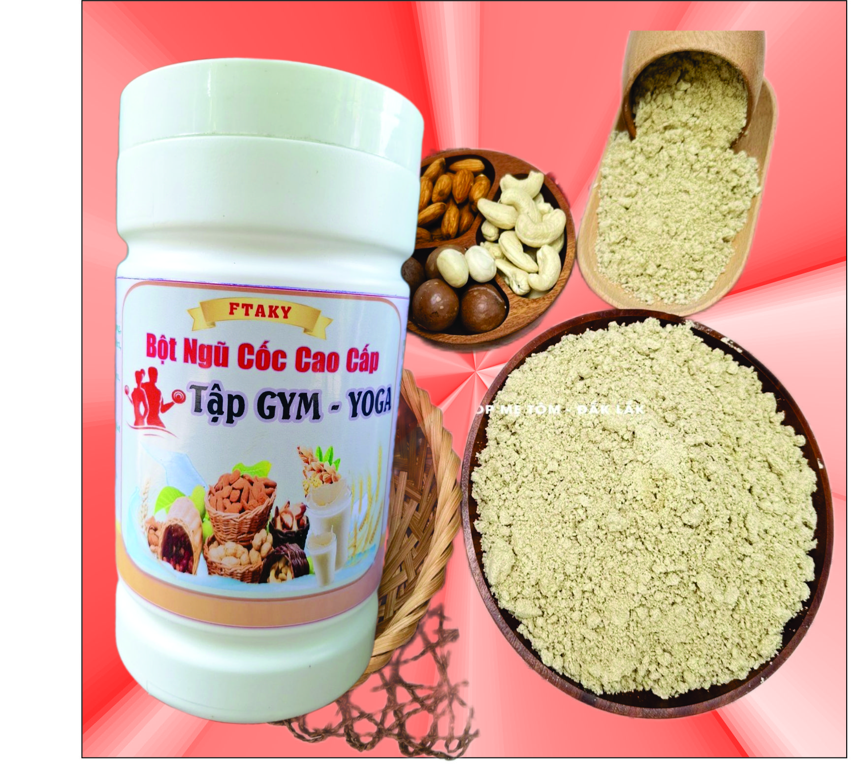 Thành Phần: Hạt sen, Hoài sơn, Kỷ tử, Khiếm thực, Đậu nành, Gạo, Ngô, Bột Kem, Bắp, Sữa bột gầy, Đường Isomalt, Đường ăn kiêng. * Công dụng: Bột ngũ cốc ăn kiêng Việt đài