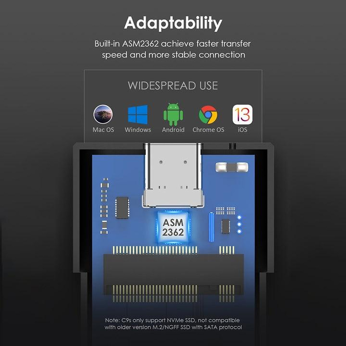 Box ổ cứng SSD M2 NVMe 0.33m Lention C9s NVMe(M.2) SSD Case with 0.33m USB-C and USB-A Cable Biến SSD M2 NVMe thành ổ cứng di động Cổng USB C & A đến M.2 NVMe, Bộ điều hợp ổ cứng lên đến USB 3.1 Thế hệ 2 Tốc độ (10Gbps), Bao gồm cả Cáp USB-C và USB 3.0, Hỗ trợ SSD M.2 NVMe 2280 2260 2242 2230