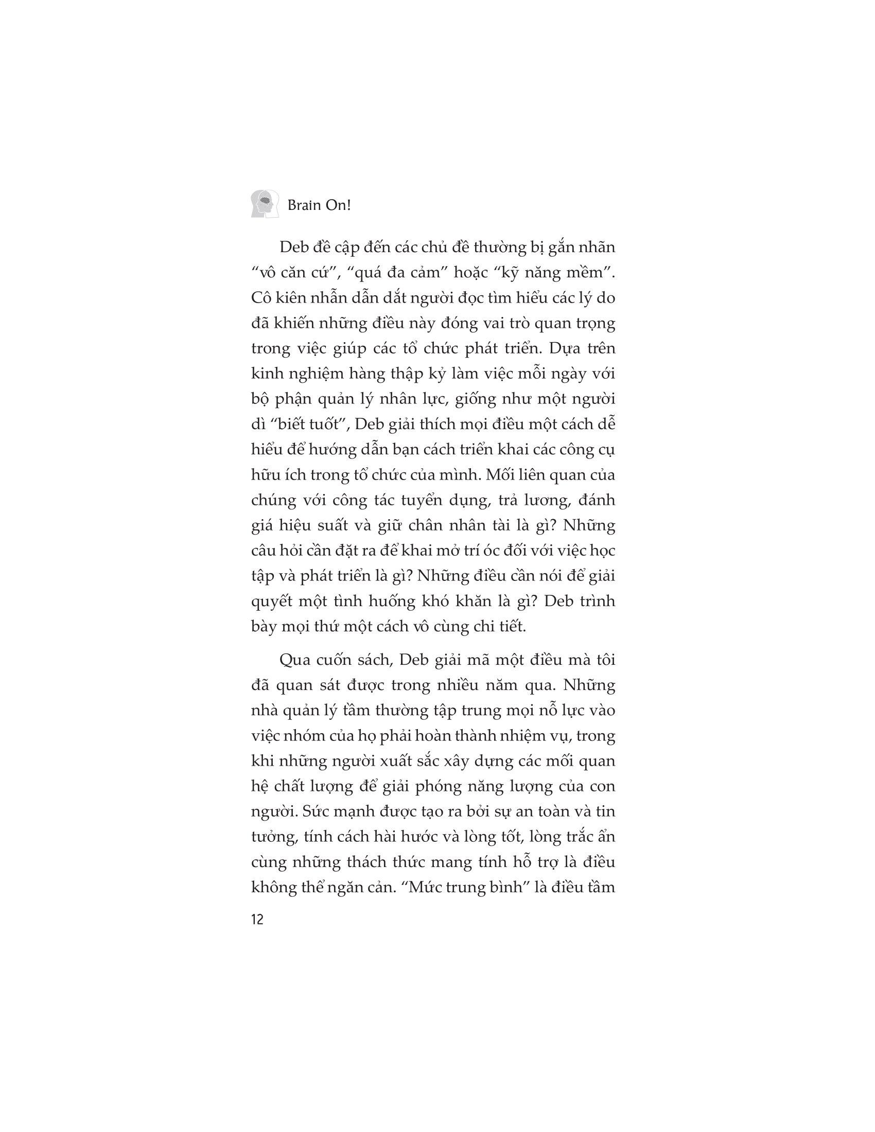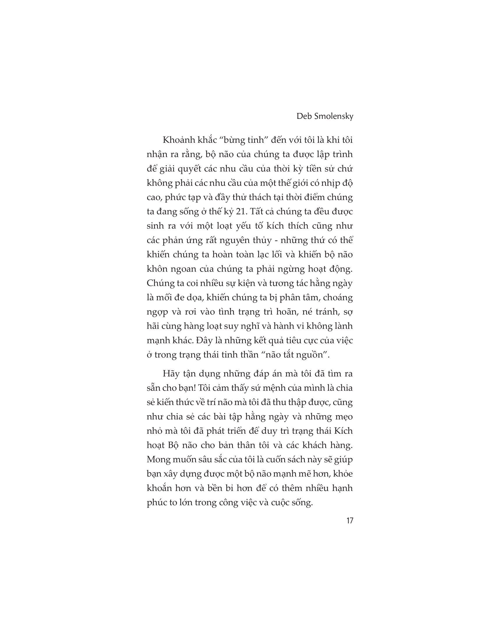 Trong Brain On!, tác giả Deb Smolensky giới thiệu các chiến lược rèn luyện tinh thần có tính thực tiễn cao để bạn sẵn sàng thể hiện bản thân trong môi trường làm việc nhiều áp lực và luôn thay đổi. Điều chúng ta hướng tới không chỉ là hoàn thành các mục tiêu công việc với hiệu suất tối ưu, mà còn là làm điều đó trong khi vẫn đảm bảo được sức khỏe tinh thần và thể chất, tràn đầy năng lượng cũng như tinh thần tích cực.