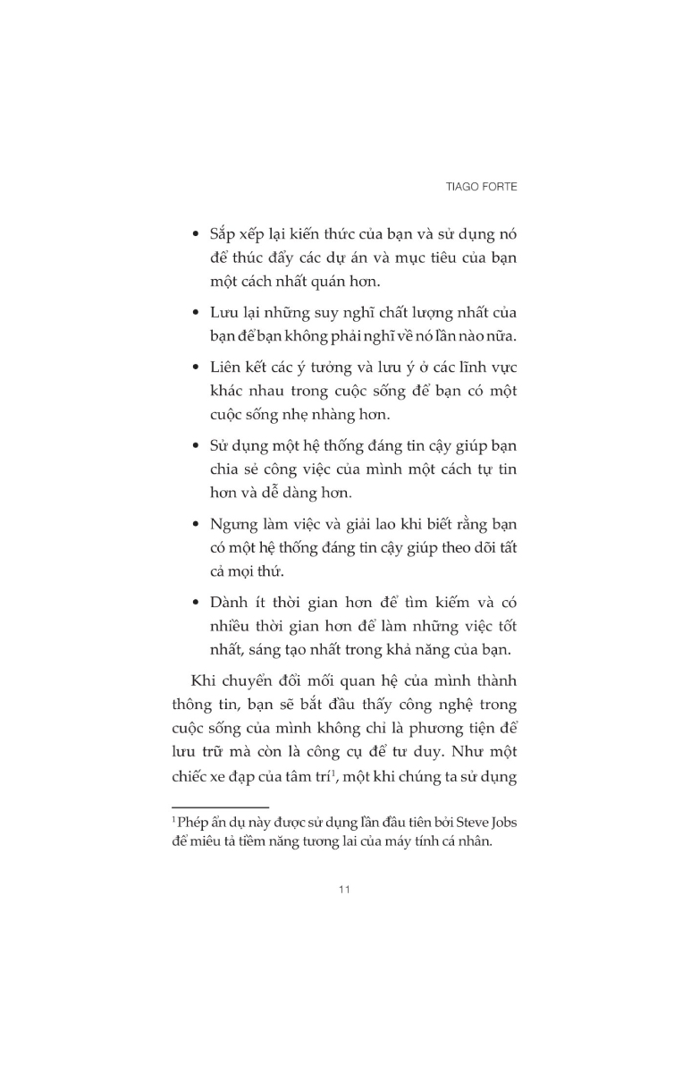 Buiding A Second Brain - Thiết Lập Bộ Não Thứ Hai GIỚI THIỆU SÁCH: Trong thời đại công nghệ thông tin phát triển mạnh mẽ, việc truy cập vào kho tàng kiến thức khổng lồ trở nên dễ dàng hơn bao giờ hết, nhưng cũng đặt ra thách thức về việc quản lý và sử dụng thông tin. Building A Second Brain - Thiết Lập Bộ Não Thứ Hai của Tiago Forte là một cuốn sách mang tính cách mạng, cung cấp hướng dẫn chi tiết về cách xây dựng hệ thống quản lý thông tin cá nhân hiệu quả. Cuốn sách giới thiệu khái niệm "bộ não thứ hai" - một kho lưu trữ kỹ thuật số có tổ chức và đáng tin cậy, giúp bạn lưu trữ, sắp xếp và sử dụng hiệu quả thông tin từ các ý tưởng, ghi chú sáng tạo đến kinh nghiệm quan trọng, đồng bộ hóa trên tất cả các thiết bị và nền tảng. Cuốn sách sẽ giúp bạn xây dựng một hệ thống lưu trữ thông tin cá nhân hiệu quả, tổ chức và lọc thông tin dễ dàng tìm kiếm và sử dụng, áp dụng hệ thống Second Brain vào cuộc sống hàng ngày để đưa ra quyết định và giải quyết vấn đề hiệu quả hơn. Bạn sẽ học cách tự động hóa và tối ưu hóa quy trình lưu trữ và xử lý thông tin, biến những gì bạn biết thành những cải tiến mạnh mẽ và có ý nghĩa trong công việc và cuộc sống. Về tác giả Tiago Forte, ông là một trong những chuyên gia hàng đầu về hiệu suất cá nhân, đã giảng dạy cho hàng nghìn người về các nguyên tắc thời gian và công nghệ tiên tiến nhất để cách mạng hóa năng suất, sự sáng tạo và hiệu quả cá nhân. Ông từng làm việc với nhiều tổ chức lớn như Genentech, Tập đoàn Toyota Motor và Ngân hàng Phát triển Inter-American. Tiago Forte cũng xuất hiện trên nhiều ấn phẩm uy tín như New York Times, The Atlantic và Harvard Business Review.