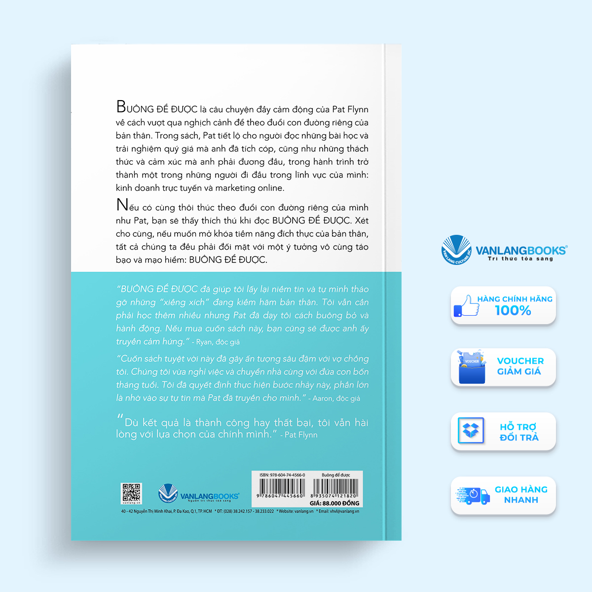 - Giới thiệu sách Buông để được là câu chuyện đầy cảm động của Pat Flynn về cách vượt qua nghịch cảnh để theo đuổi con đường riêng của bản thân. Trong sách, Pat tiết lộ cho người đọc những bài học và trải nghiệm quý giá mà anh đã tích cóp, cũng như những thách thức và cảm xúc mà anh phải đương đầu, trong hành trình trở thành một trong những người đi đầu trong lĩnh vực của mình: kinh doanh trực tuyến và marketing online. Nếu có cùng thôi thúc theo đuổi con đường riêng của mình như Pat, bạn sẽ thấy thích thú khi đọc Buông để được. Xét cho cùng, nếu muốn mở khóa tiềm năng đích thực của bản thân, tất cả chúng ta đều phải đối mặt với một ý tưởng vô cùng táo bạo và mạo hiểm: buông để được. Lời bình “Buông để được đã giúp tôi lấy lại niềm tin và tự mình tháo gỡ những “xiềng xích” đang kiềm hãm bản thân. Tôi vẫn cần phải học thêm nhiều nhưng Pat đã dạy tôi cách buông bỏ và hành động. Nếu mua cuốn sách này, bạn cũng sẽ được anh ấy truyền cảm hứng.” - Ryan, độc giả “Cuốn sách tuyệt vời này đã gây ấn tượng sâu đậm với vợ chồng tôi. Chúng tôi vừa nghỉ việc và chuyển nhà cùng với đứa con bốn tháng tuổi. Tôi đã quyết định thực hiện bước nhảy này, phần lớn là nhờ vào sự tự tin mà Pat đã truyền cho mình.” - Aaron, độc giả “Dù kết quả là thành công hay thất bại, tôi vẫn hài lòng với lựa chọn của chính mình.” - Pat Flynn