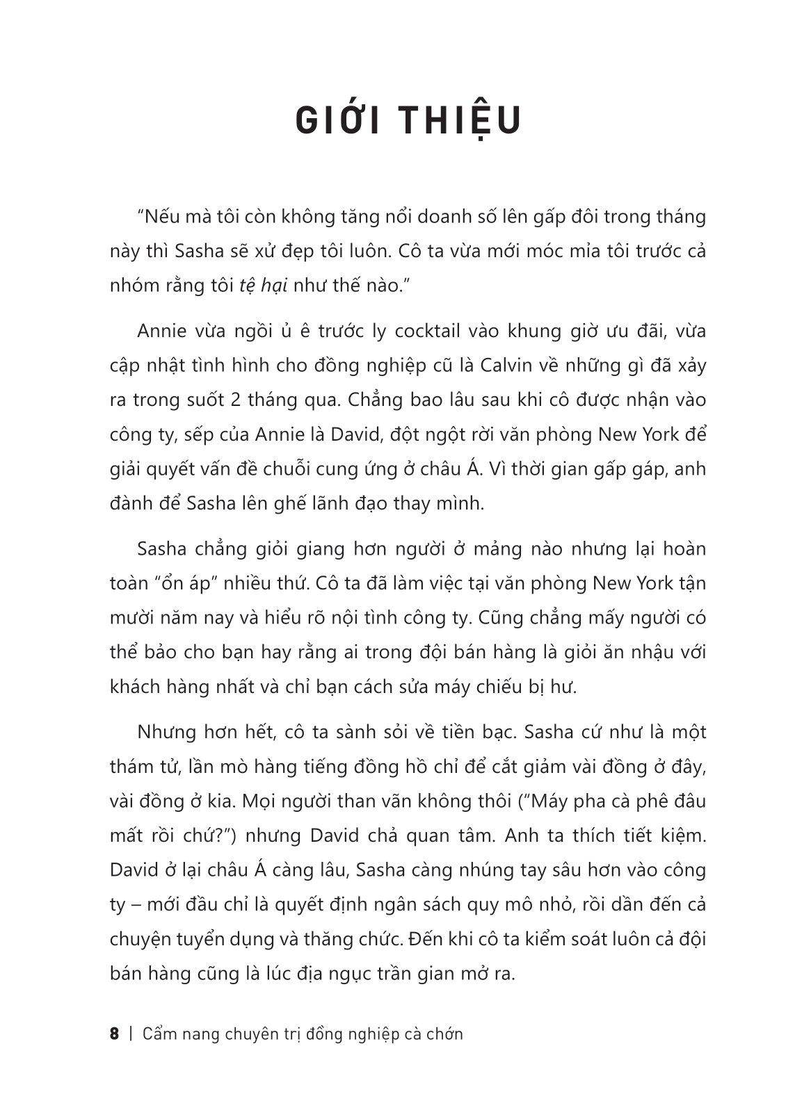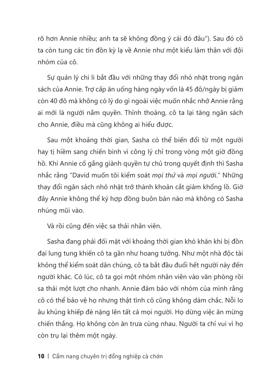 Để giải mã lý do và vượt qua rào cản tâm lý, CẨM NANG CHUYÊN TRỊ ĐỒNG NGHIỆP CÀ CHỚN sẽ giúp bạn đi sâu vào “điều tra” các kiểu đồng nghiệp tồi và tìm ra phương pháp ứng phó hiệu quả. Đôi khi chiến lược không đòi hỏi cao siêu hay buộc bạn phải đối đầu trực tiếp. Dù là người mới đi làm đang gặp khó khăn trong công việc, là quản lý hay thành viên của các hội nhóm, cuốn sách này sẽ là một kim chỉ nam giúp dân văn phòng sinh tồn chốn công sở.