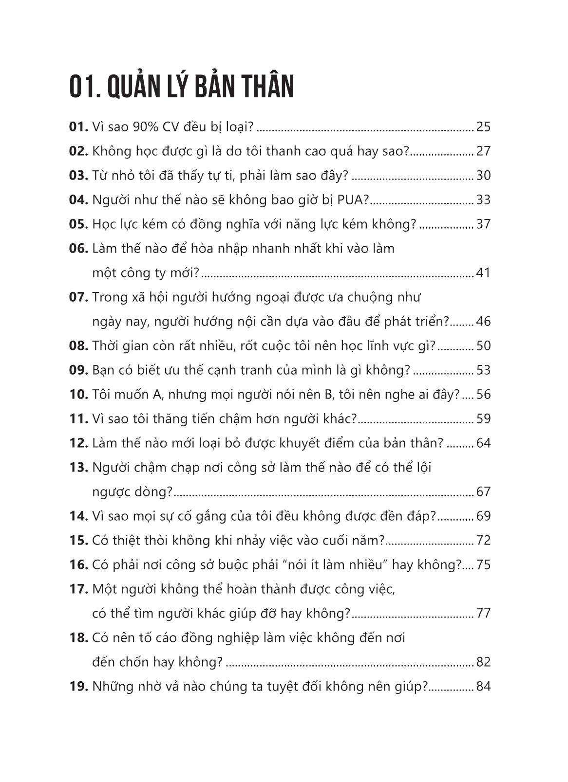 Muốn thăng tiến sự nghiệp, đừng chỉ trả lời câu hỏi của sếp. Hãy học cách giải quyết vấn đề. Bạn muốn trở thành một nhân sự “không thể thay thế”? Bạn muốn tiếng nói của m.ình được lắng nghe? Bạn muốn tận dụng tối đa nguồn lực từ sếp và nhân viên của m.ình? Cẩm nang thăng tiến sự nghiệp cho phụ nữ hiện đại sẽ là cố vấn tin cậy, giúp bạn hình thành tư duy làm việc chuyên nghiệp, xác định ưu thế cạnh tranh và thiết lập các mối quan hệ “có ích”.