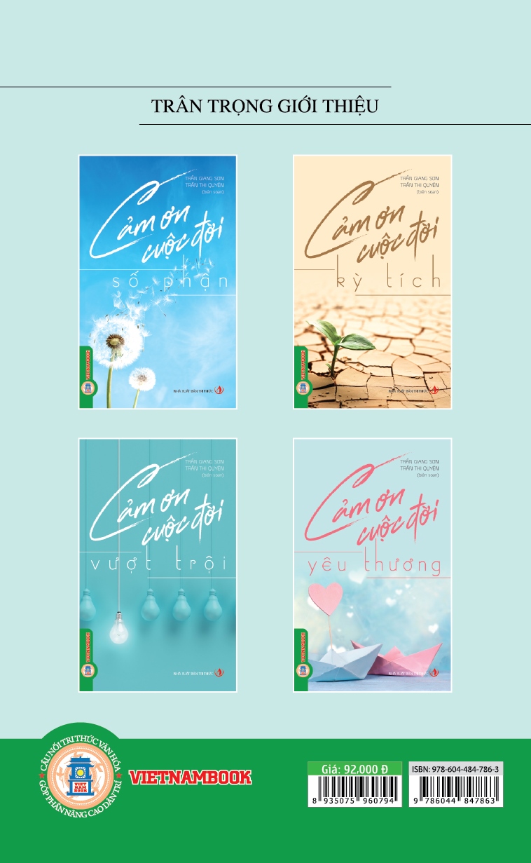 Bộ sách “Cảm ơn cuộc đời” gồm 4 quyển, chia sẻ những khoảnh khắc tuyệt diệu của cuộc sống, giúp mỗi người chúng ta có cơ hội nhìn lại và thấu hiểu giá trị thực sự của những điều xung quanh, từ đó thêm yêu cuộc sống, làm cho cuộc đời trở nên vui vẻ, hạnh phúc và hoàn mỹ hơn. Giá trị của “Yêu thương” trong cuộc sống là sự chia sẻ, đồng cảm, khoan dung, độ lượng và nhẫn nhịn… xuất phát từ sâu trong tâm hồn, thể hiện sự gắn kết lâu dài mọi người với nhau để cùng cảm nhận, có thêm niềm tin vào cuộc sống, và để mỗi giây phút của cuộc sống trở nên ý nghĩa và thiết thực.