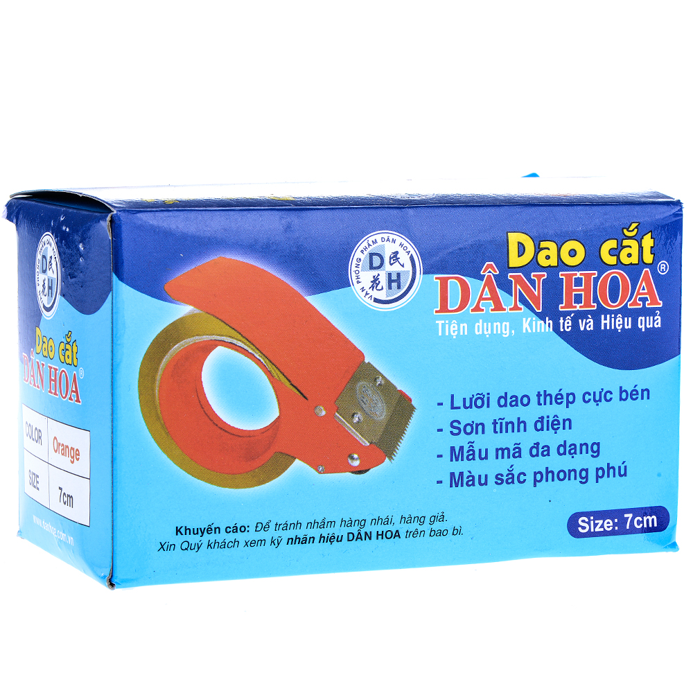 - Dao cắt băng keo Dân Hoa cầm tay kích thước 5cm giúp người sử dụng dễ dàng điều khiển việc cắt dán băng keo thật tiện lợi và an toàn với tay cầm chắc