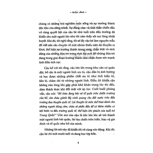 Cậu bé đạp gió rẽ sóng I. Giới Thiệu Sách “Cậu bé đạp gió rẽ sóng” - một tác văn học thiếu nhi xuất sắc của nhà văn Triệu Lăng - là câu chuyện đầy cảm hứng của cậu bé mười tuổi Tần Hải Tâm, con trai của một người lính hải quân. Từ một cậu bé vốn quen sống ở đồng bằng, Tần Hải Tâm đã dần hòa nhập với môi trường sống ở vùng biển và cũng dần cảm nhận sâu sắc về trách nhiệm, tình yêu đất nước, sự hy sinh to lớn của những người cha, người mẹ là lính hải quân.   Trải qua quá trình luyện tập theo chế độ vô cùng khắt khe của người bố, cậu bé đã vượt qua nỗi sợ đối với biển cả và trở thành nhà vô địch Giải Lái thuyền thế giới dành cho thiếu niên.“Tôi nghĩ rằng cuộc đời cũng vậy. Cuộc đời của mỗi người đều giống như một chuyến đi biển. Có lúc trời yên biển lặng, có lúc biển động sóng lớn, không phải lúc nào cũng thuận buồm xuôi gió. Nhưng dù phải đối mặt với khó khăn, nguy hiểm như thế nào, chỉ cần bạn giữ được tinh thần lạc quan và thái độ bình tĩnh thì chắc chắn sẽ có thể giữ được nụ cười tự tin mà vượt qua hoàn cảnh khó khăn, đạp gió rẽ sóng trên biển lớn của cuộc đời.” – Triệu Lăng. Tác giả: Triệu Lăng sinh ngày 01/09/1984, là thành viên của Hiệp hội Nhà văn Trung Quốc, hiện là biên tập của tạp chí Văn học và Nghệ thuật Thiếu niên, nhà xuất bản Thiếu niên Nhi đồng Phượng Hoàng - tỉnh Giang Tô. Cô bắt đầu sáng tác từ năm 13 tuổi và đã có rất nhiều tác phẩm được xuất bản. Triệu Lăng được bầu chọn là “Anh tài văn hóa Tử Kim tỉnh Giang Tô”. Các tác phẩm đã xuất bản: Nước lớn, Ngày cha trở thành ngôi sao, Cỏ linh lăng bay về phương Nam, Cậu bé đạp gió rẽ sóng…Triệu Lăng đã giành được nhiều giải thưởng như: Giải thưởng Xuất bản xuất sắc Trung Quốc, Giải thưởng Sách hay Trung Quốc, Giải thưởng Nhi đồng Nguyệt quế, Giải thưởng Dự án Năm Một tỉnh Giang Tô, Giải thưởng Sách thiếu nhi Băng Tâm... Tác phẩm Cậu bé đạp gió rẽ sóng đã giành được: Giải Sách hay Trung Quốc năm 2020 do Hiệp hội Đánh giá Sách Trung Quốc tổ chức, được Ban Tuyên giáo Trung ương Trung Quốc bình chọn là “Dự án Xuất bản Văn học Thiếu nhi Xuất sắc”, được Cục Quản lý Xuất bản và Báo chí Quốc gia đề cử vào 100 ấn phẩm xuất sắc cho thanh thiếu niên trên toàn quốc, Giải Văn học Thiếu nhi Băng Tâm và các giải thưởng khác. II. Thông Tin Chi Tiết Mã Hàng: 8938538124139 Nhà Cung Cấp: Công Ty Cổ Phần Văn Hóa Văn Lang Tác Giả: Triệu Lăng Người Dịch: Nhà Xuất Bản: NXB Lao Động Năm Xuất Bản: 2024 Ngôn Ngữ: Tiếng Việt Trọng Lượng: 738 gram Kích Thước: 16 x 22 Số Trang: 372 Hình Thức: Bìa Mềm
