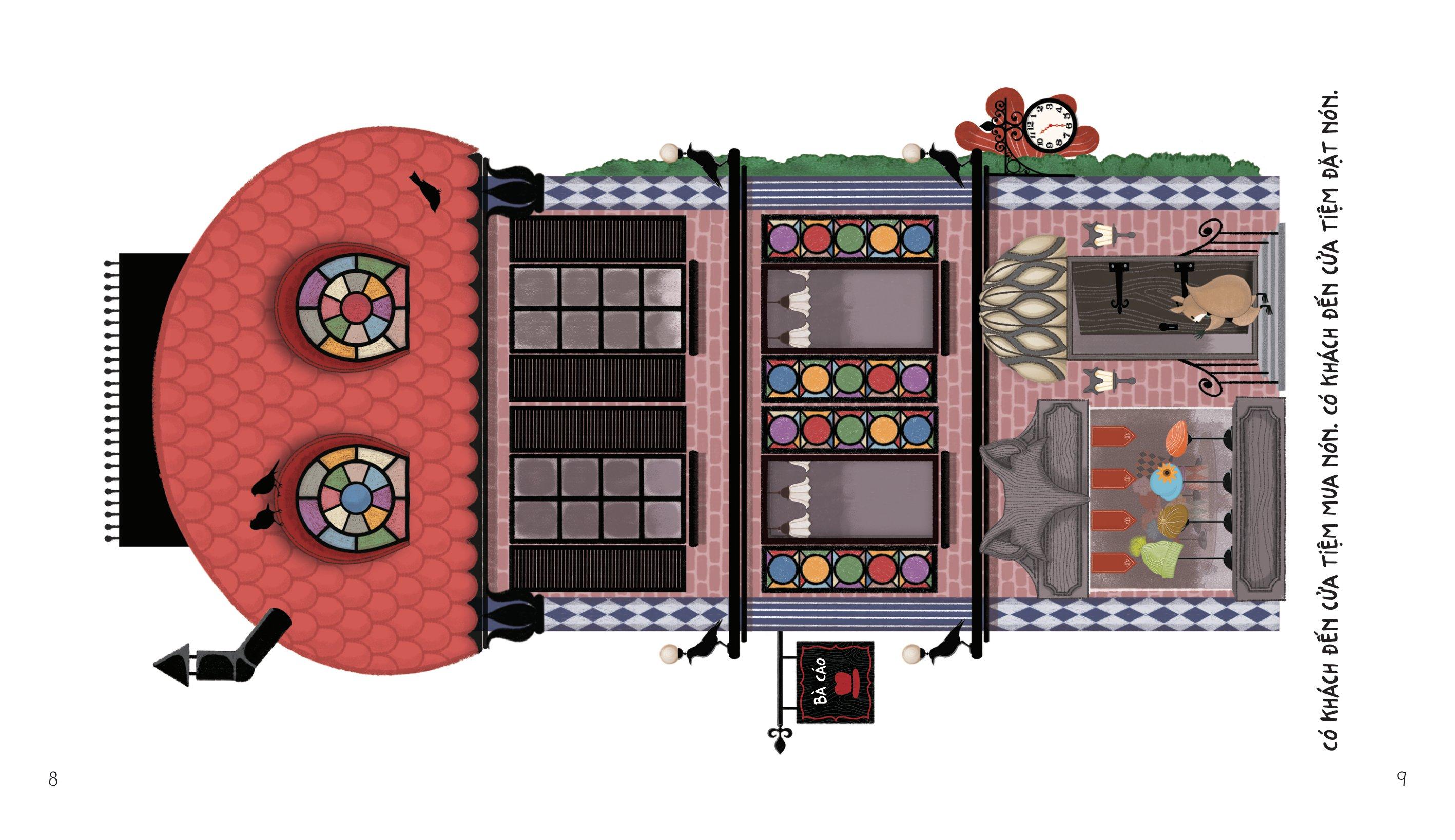 Mỗi ngày Bà Cáo đều say mê làm nón. Cửa tiệm của Bà Cáo có đủ kiểu nón đẹp nhất trên đời: Nón bê rê, nón chóp cao, nón lưỡi trai… Mỗi vị khách lại yêu thích một loại nón riêng. Mời bạn đến thăm cửa tiệm tuyệt vời của Bà Cáo nhé!