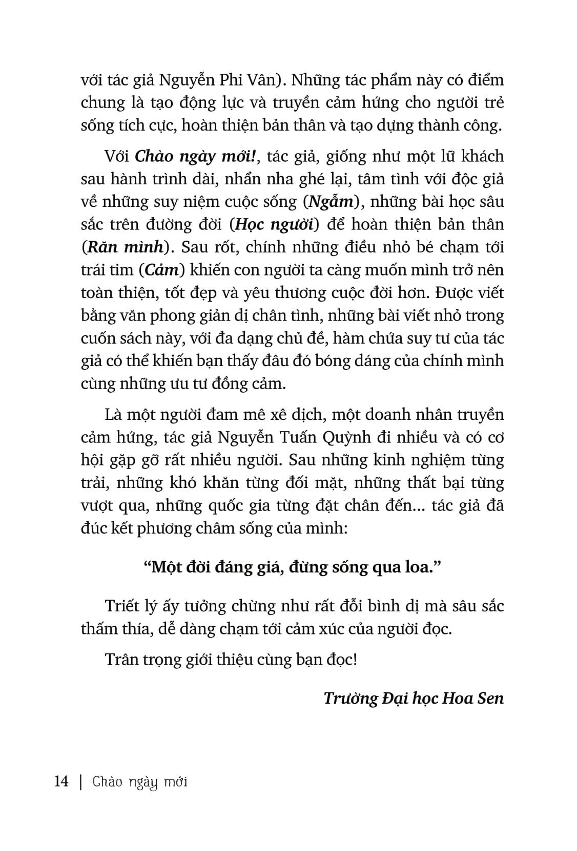“Một đời đáng giá, đừng sống qua loa!” Đó cũng chính là tinh thần của quyển sách và là châm ngôn sống của tác giả Nguyễn Tuấn Quỳnh - một tên tuổi lẫy lừng một thời của ngành xăng dầu “xê dịch” đến ngành xuất bản cùng hơn 20 năm kinh nghiệm ở vị trí điều hành kinh doanh cấp cao. Trải qua đủ những nốt thăng trầm, thấu cảm cả những giai điệu từ hân hoan đến bi ai của bản nhạc cuộc đời; những câu từ giản dị, chân tình trong “Chào ngày mới!” như chất chứa tất cả sự tâm huyết và trân trọng của người đi trước gửi đến thế hệ trẻ.