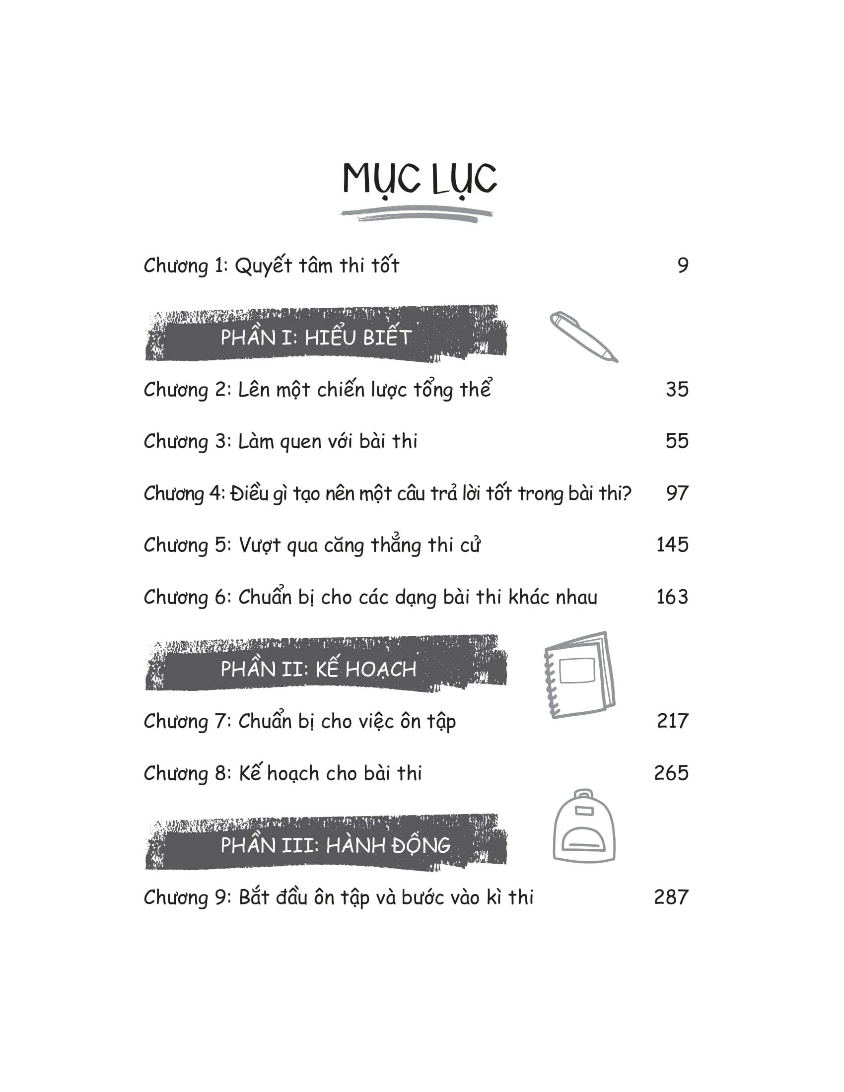 - Hình thành hiểu biết sâu sắc về các bài thi và cách chuẩn bị cho chúng để bạn có thể tiếp cận chúng một cách tự tin và thành công ở hiện tại cũng như tương lai. Bên cạnh đó, cuốn sách sẽ giúp các bạn sinh viên xây dựng hiểu biết về các dạng bài thi thường gặp tại đại học, đồng thời hướng dẫn sinh viên lên chiến lược, lập kế hoạch ôn tập và tham dự kì thi sao cho đạt kết quả tốt nhất. Không chỉ vậy, sinh viên cũng sẽ học được cách vượt qua căng thẳng thi cử và ổn định về tâm lí để chinh phục kì thi. Đây chắc chắn là người bạn đồng hành không thể thiếu của sinh viên trong mọi bài thi tại giảng đường đại học.