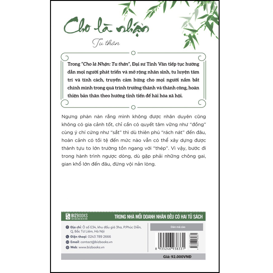 Sự sống vô hạn vượt qua thời gian, ánh sáng vô hạn vượt qua không gian. Cơ thể con người có sinh có diệt, nhưng sinh mệnh thật sự luôn bất tử. Mỗi con người chúng ta đều có một sinh mệnh bất tử, đó chính là con người thật của chúng ta! Với cuốn sách Cho là nhận: Tu Thân, nội dung quan trọng của nó chính là cái bên trong của con người, liên quan đến việc tu dưỡng đạo đức, gọt giũa tầm nhìn và rèn luyện được tính biết kiềm chế, buông bỏ sân hận. Từ đó, bạn có thể xác lập tâm thế bên trong khi tiến hành đối đãi với những người và những sự việc trong xã hội.
