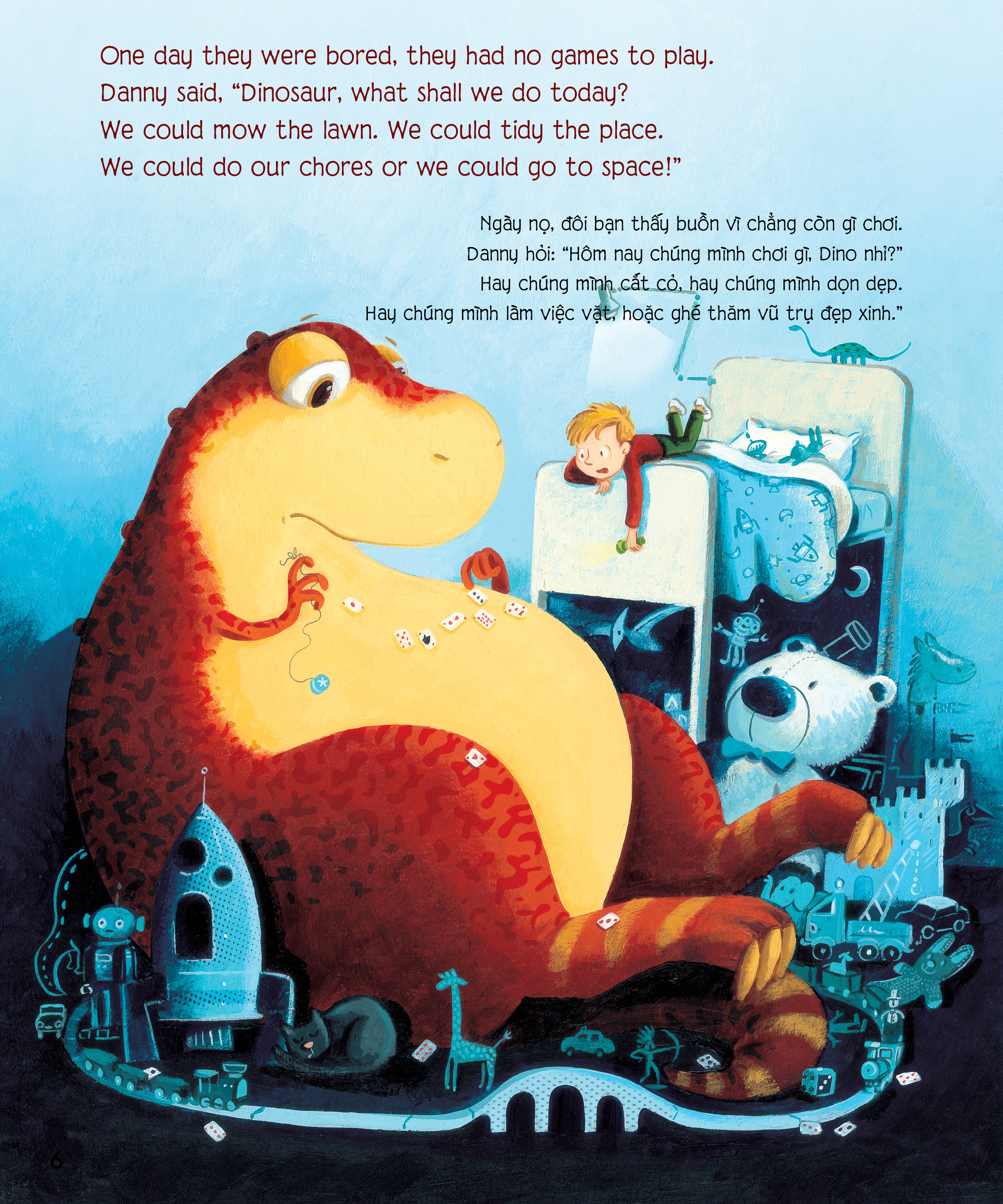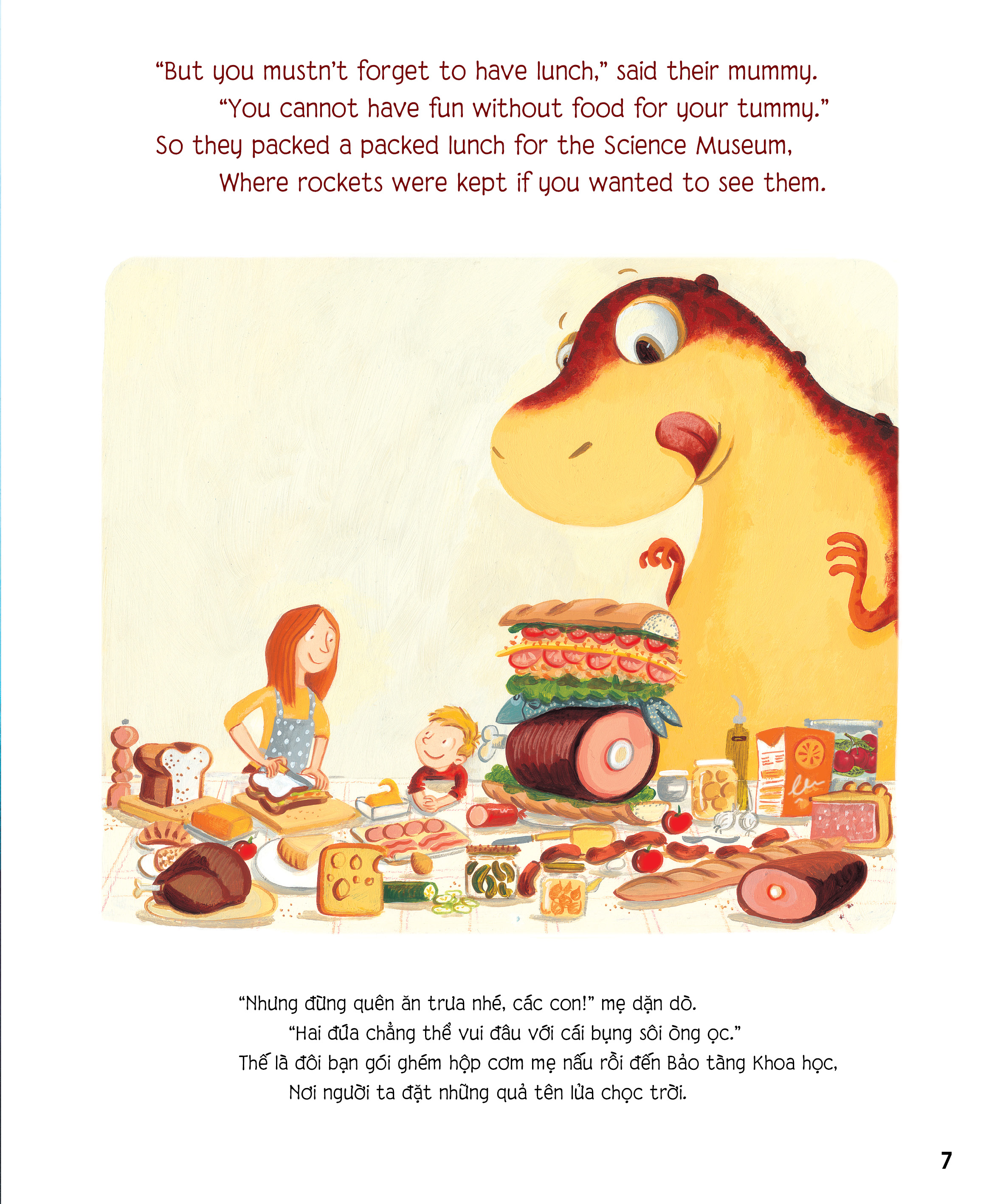 Chú khủng long tham ăn SONG NGỮ dành cho lứa tuổi mẫu giáo và tiểu học (2-8 TUỔI) là thế giới đầy sắc màu của đôi bạn thân Danny và chú khủng long Dino dễ thương nhưng háu ăn. Hễ đói, chú ăn tất tật mọi thứ trong tầm mắt, từ chiếc giường, nàng công chúa, bố, mẹ, bà, ngôi nhà đang ở, cầu vồng và thậm chícả một hành tinh khổng lồ. Nhưng ăn xong, cậu đều hối hận vô cùng và đều rút ra được bài học cho bản thân. Cuối cùng, để sửa chữa sai lầm, cậu quyết định ị ra trả lại mọi thứ nguyên vẹn.