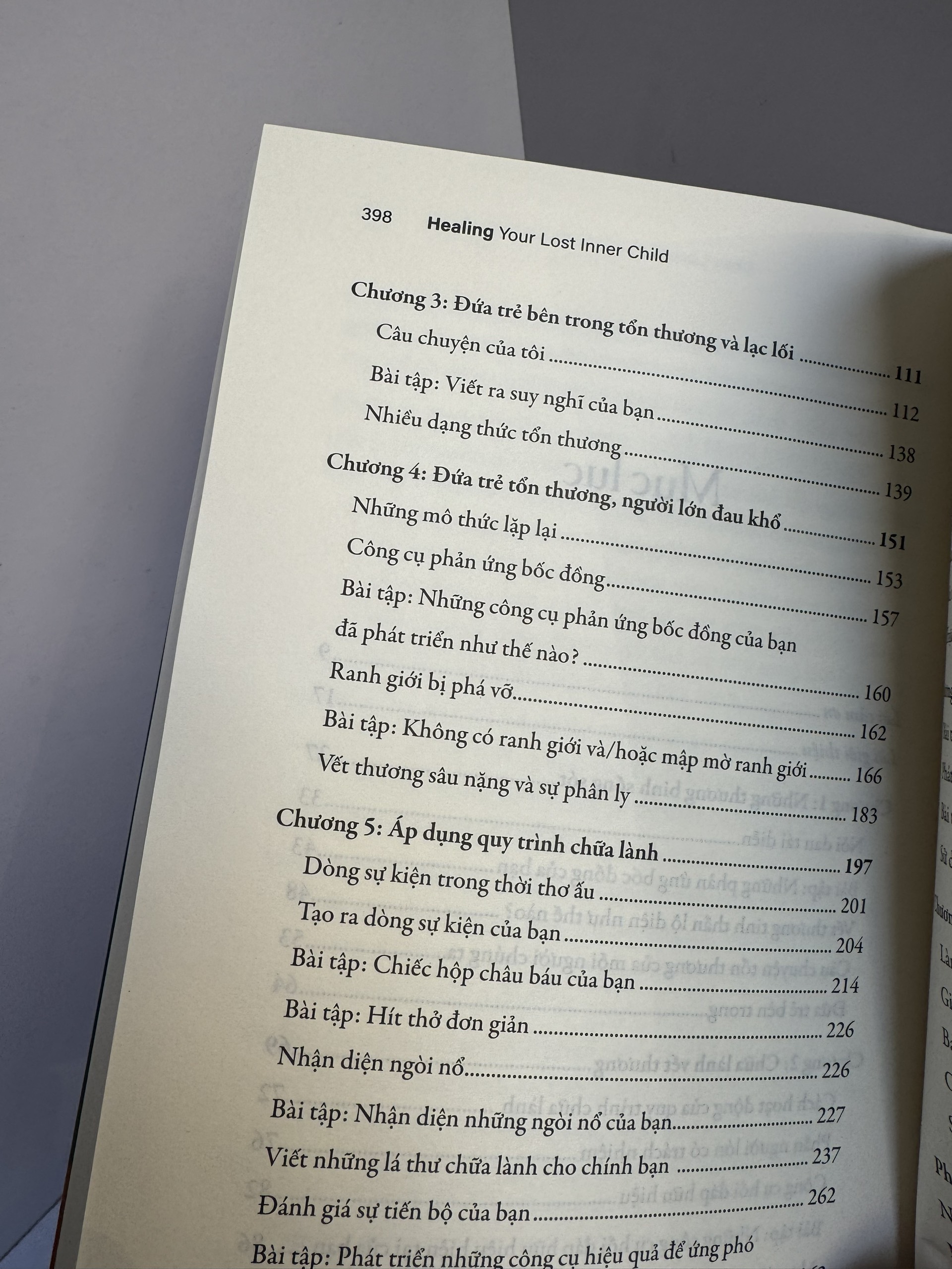 Thông qua các bài tập và câu chuyện của những người đã được chữa lành cũng như của chính tác giả, cuốn sách hướng dẫn làm thế nào để thấu hiểu “đứa trẻ tổn thương” bên trong chính mình và cách để kết nối phần nội tâm này với “phần trưởng thành”. Chẳng hạn như nhìn lại dòng sự kiện thời thơ ấu, viết thư trao đổi giữa phần trưởng thành và phần tổn thương, liên hệ những phản ứng bốc đồng trong hiện tại với nguyên nhân trong quá khứ… Việc viết những lá thư chữa lành qua lại với chính mình là một cách tuyệt vời để nhanh chóng làm bộc lộ những cảm xúc và kết nối với phần tổn thương bên trong bạn. Bạn đọc cũng sẽ hiểu cách mà “phần người lớn có trách nhiệm” có thể phát triển một bộ công cụ hồi đáp mới, tích cực hơn, thay thế cho những kiểu phản ứng cũ của đứa trẻ tổn thương bên trong.
