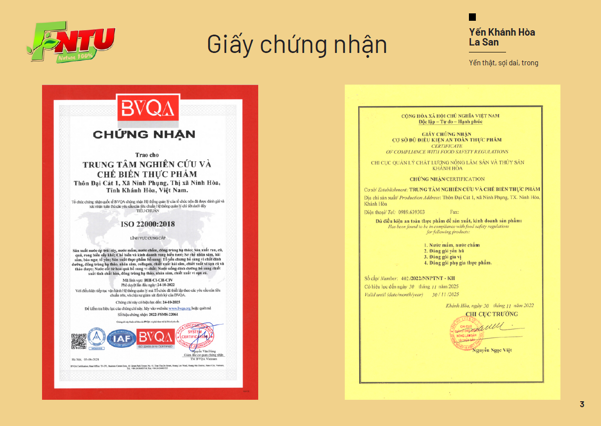 Thông tin sản phẩm : • Thành phần: Yến tươi tinh chế 30%, nước, Taurine(50mg),Lysine(50mg), glycine(25mg), nano canxi(25mg) đường phèn, chất ổn định (E406,E401), hương liệu. • Nơi sản xuất : Đại học Nha Trang